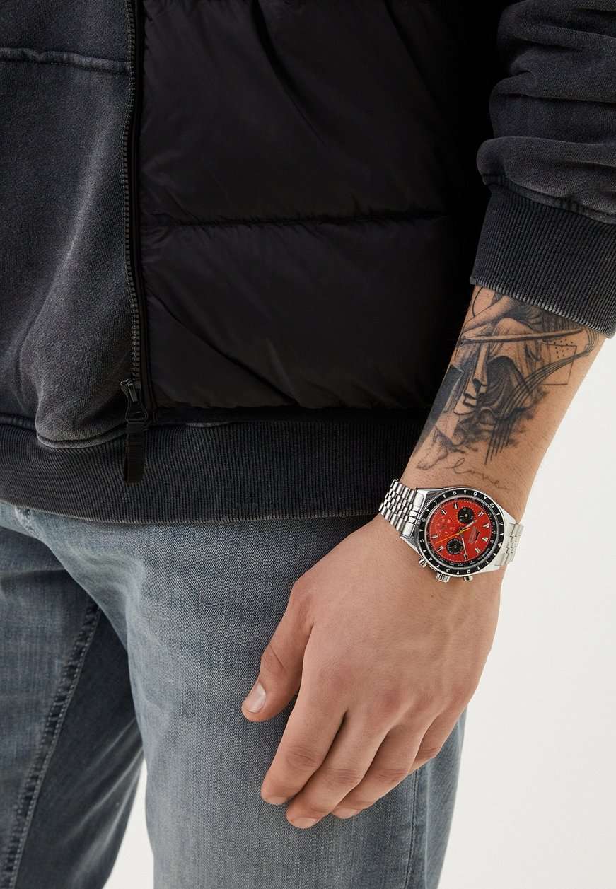 Часы Slazenger SL.09.2248.2.05 — это современная модель с выразительным спортивным характером, идеально подходящая для активного образа жизни. Корпус выполнен из прочного металла, красный циферблат защищён минеральным стекломМинеральное стеклоМинеральное стекло представляет собой искусственно выращенный минерал кварца. Такое стекло отличается особой устойчивостью к повреждениям и царапинам. Уступает по некоторым качествам сапфировому стеклу., устойчивым к царапинам. Часы также оснащены шкалой тахиметраТахиметрРазмеченная шкала, располагается на ободке или безеле часов. Тахиметр позволяет рассчитать скорость на определённом участке пути, расстояние измеряется в километрах или милях., что добавляет им функциональности и может быть полезно для измерения скорости.  На безельБезельВнешний ободок, закрепляющий стекло. В спортивных часах так называется поворотное кольцо с делениями на циферблате, выполняет роль таймера – замеряет отрезки времени на шкале. Неподвижный безель – элемент декора. Однонаправленно вращающийся безель на дайверских часах позволяет фиксировать моменты погружения и выныривания на поверхность. нанесено черное IP-покрытиеIP-покрытиеМетод ионного напыления. Демонстрирует повышенную устойчивость к истиранию, окислению и химическим веществам. Под воздействием высокого давления и температуры около 1500°C молекулы металла надёжно соединяются с частицами корпуса часов..  Диаметр корпуса составляет 46 мм, толщина — 11 мм, а ширина браслета — 22 мм.  Часы оснащены металлическим браслетом с надежной раскладной застёжкойРаскладная застёжкаТакой тип застёжки используется только на браслетах из металла. Она никогда не раскрывается полностью, происходит разделение на 2 и более частей. Раскладывающая застёжка снизит вероятность потери часов к минимуму., благодаря чему часы удобно сидят на руке и не вызывают дискомфорта даже при длительном ношении. Вес модели составляет 130 грамм. Надёжный кварцевый механизм обеспечивает точность времени, а уровень водозащиты WR 50 позволяет использовать часы в повседневных условиях, не опасаясь случайных брызг или дождя. Для удобства использования в темное время суток предусмотрено люминесцентное покрытиеЛюминесцентное покрытиеПозволяет считывать показания времени в темноте. Производители наносят на стрелки, часовые индексы, безель или поверхность циферблата светонакопительный состав, дающий холодное свечение. стрелок и меток. Дополнительные малые циферблаты показывают дату, день недели и текущее время в 24-часовом формате, что делает использование часов ещё более удобным и функциональным.