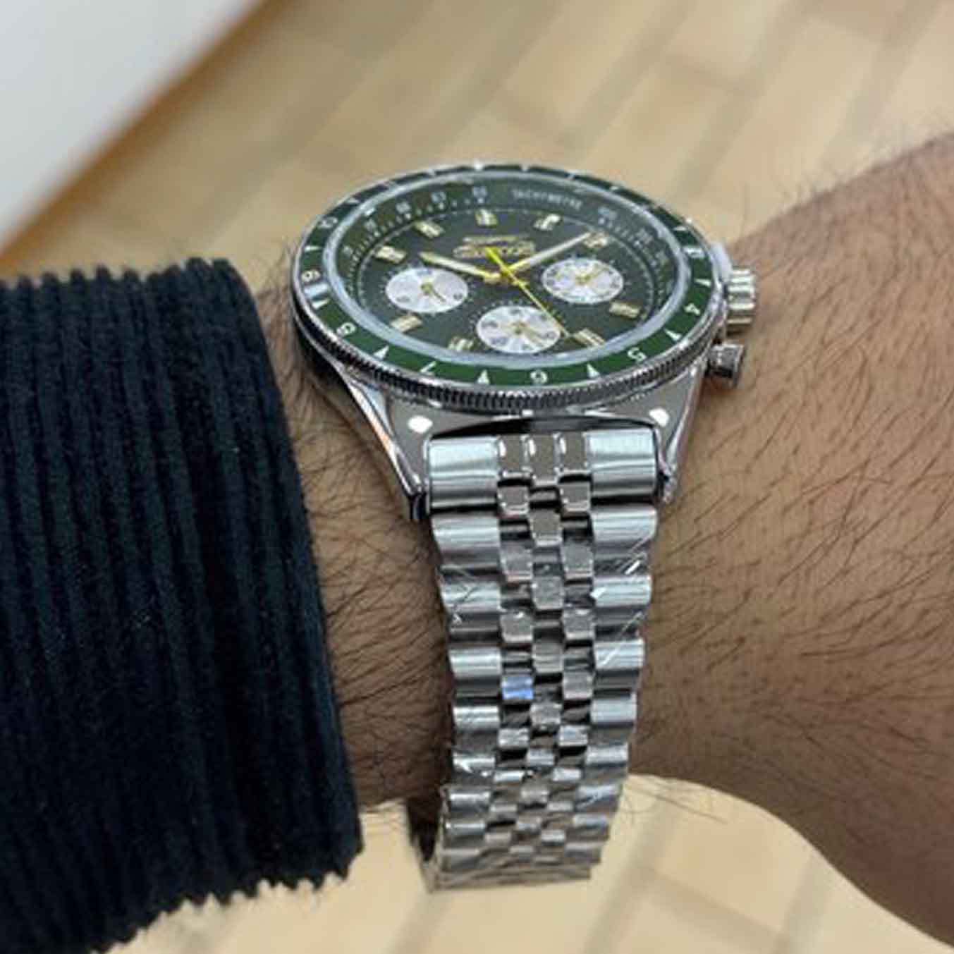 Часы Slazenger SL.09.2248.2.06 — это современная модель с выразительным спортивным характером, идеально подходящая для активного образа жизни. Корпус выполнен из прочного металла, зеленый циферблат защищён минеральным стекломМинеральное стеклоМинеральное стекло представляет собой искусственно выращенный минерал кварца. Такое стекло отличается особой устойчивостью к повреждениям и царапинам. Уступает по некоторым качествам сапфировому стеклу., устойчивым к царапинам. Часы также оснащены шкалой тахиметраТахиметрРазмеченная шкала, располагается на ободке или безеле часов. Тахиметр позволяет рассчитать скорость на определённом участке пути, расстояние измеряется в километрах или милях., что добавляет им функциональности и может быть полезно для измерения скорости. На безельБезельВнешний ободок, закрепляющий стекло. В спортивных часах так называется поворотное кольцо с делениями на циферблате, выполняет роль таймера – замеряет отрезки времени на шкале. Неподвижный безель – элемент декора. Однонаправленно вращающийся безель на дайверских часах позволяет фиксировать моменты погружения и выныривания на поверхность. нанесено зеленое IP-покрытиеIP-покрытиеМетод ионного напыления. Демонстрирует повышенную устойчивость к истиранию, окислению и химическим веществам. Под воздействием высокого давления и температуры около 1500°C молекулы металла надёжно соединяются с частицами корпуса часов.. Диаметр корпуса составляет 46 мм, толщина — 11 мм, а ширина браслета — 22 мм. Часы оснащены металлическим браслетом с надежной раскладной застёжкойРаскладная застёжкаТакой тип застёжки используется только на браслетах из металла. Она никогда не раскрывается полностью, происходит разделение на 2 и более частей. Раскладывающая застёжка снизит вероятность потери часов к минимуму., благодаря чему часы удобно сидят на руке и не вызывают дискомфорта даже при длительном ношении. Вес модели составляет 130 грамм. Надёжный кварцевый механизм обеспечивает точность времени, а уровень водозащиты WR 50 позволяет использовать часы в повседневных условиях, не опасаясь случайных брызг или дождя. Для удобства использования в темное время суток предусмотрено люминесцентное покрытиеЛюминесцентное покрытиеПозволяет считывать показания времени в темноте. Производители наносят на стрелки, часовые индексы, безель или поверхность циферблата светонакопительный состав, дающий холодное свечение. стрелок и меток. Дополнительные малые циферблаты показывают дату, день недели и текущее время в 24-часовом формате, что делает использование часов ещё более удобным и функциональным.