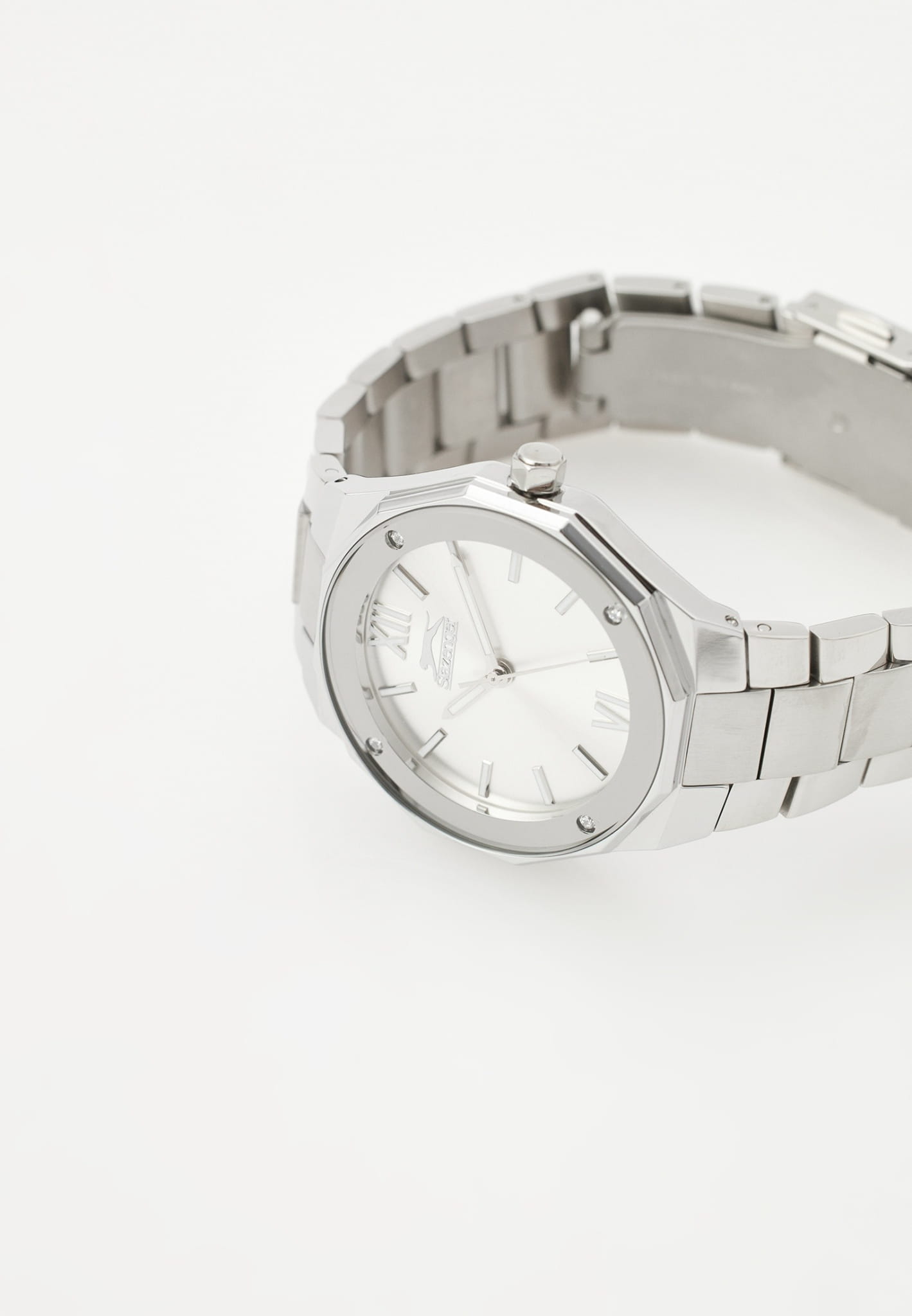 Часы Slazenger SL.09.2258.3.01 — это изысканный аксессуар, который гармонично подчеркнёт ваш индивидуальный стиль. Корпус и браслет выполнены из инновационного суперметалла — сплава на основе меди с пониженным содержанием цинка и никеля, обладающего специальным защитным покрытием, а циферблат украшен 4 кристаллами. Надёжный кварцевый механизм обеспечивает точный ход, а прочное минеральное стеклоМинеральное стеклоМинеральное стекло представляет собой искусственно выращенный минерал кварца. Такое стекло отличается особой устойчивостью к повреждениям и царапинам. Уступает по некоторым качествам сапфировому стеклу. устойчиво к царапинам и защищает серебристый циферблат от внешних воздействий. Диаметр корпуса составляет 38 мм, толщина — всего 8 мм, что делает модель элегантной и удобной для ежедневного ношения. Водонепроницаемость до 3 бар позволяет не беспокоиться о случайных брызгах или каплях дождя. Стрелки с люминесцентным покрытиемЛюминесцентное покрытиеПозволяет считывать показания времени в темноте. Производители наносят на стрелки, часовые индексы, безель или поверхность циферблата светонакопительный состав, дающий холодное свечение. удобно подсвечиваются в темноте после зарядки на свету. Стальной браслет с раскладной застёжкойРаскладная застёжкаТакой тип застёжки используется только на браслетах из металла. Она никогда не раскрывается полностью, происходит разделение на 2 и более частей. Раскладывающая застёжка снизит вероятность потери часов к минимуму. обеспечивает комфортную посадку. Часы станут отличным выбором как для повседневной жизни, так и для особых случаев, а также послужат прекрасным подарком на любой праздник.