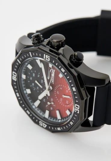 Мужские кварцевые часы Slazenger SL.09.2298.2.08 — это выразительный и функциональный аксессуар, сочетающий прочность, стиль и насыщенную комплектацию. Корпус выполнен из суперметалла с IP-покрытиемIP-покрытиеМетод ионного напыления. Демонстрирует повышенную устойчивость к истиранию, окислению и химическим веществам. Под воздействием высокого давления и температуры около 1500°C молекулы металла надёжно соединяются с частицами корпуса часов., а лицевая часть защищена минеральным стекломМинеральное стеклоМинеральное стекло представляет собой искусственно выращенный минерал кварца. Такое стекло отличается особой устойчивостью к повреждениям и царапинам. Уступает по некоторым качествам сапфировому стеклу.. Циферблат бордово-чёрного цвета оформлен с вынесенными малыми циферблатами для индикации дня недели, даты и 24-часового формата времени. Стрелки и метки покрыты люминесцентным покрытиемЛюминесцентное покрытиеПозволяет считывать показания времени в темноте. Производители наносят на стрелки, часовые индексы, безель или поверхность циферблата светонакопительный состав, дающий холодное свечение., что обеспечивает хорошую читаемость в темноте. Заводная головка снабжена защитой, а задняя крышка — завинчивающаяся, что повышает надёжность конструкции. Часы оснащены силиконовым ремешком чёрного цвета, фиксирующимся на стандартной застёжке. Водонепроницаемость 50 м позволяет использовать часы в повседневных условиях, защищая от случайных брызг и капель дождя. Модель подчёркивает индивидуальность владельца и идеально подходит как для повседневного, так и для спортивного образа.