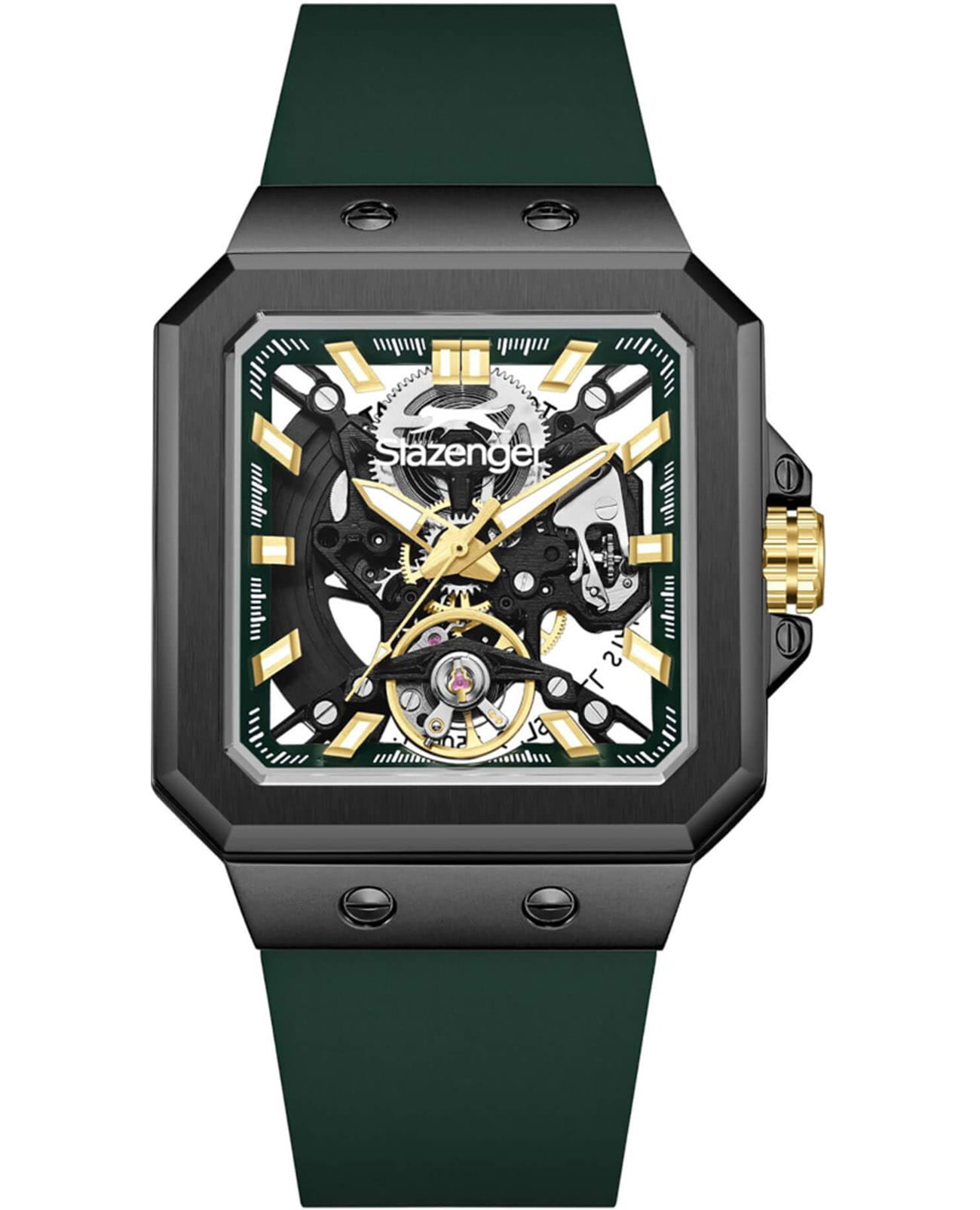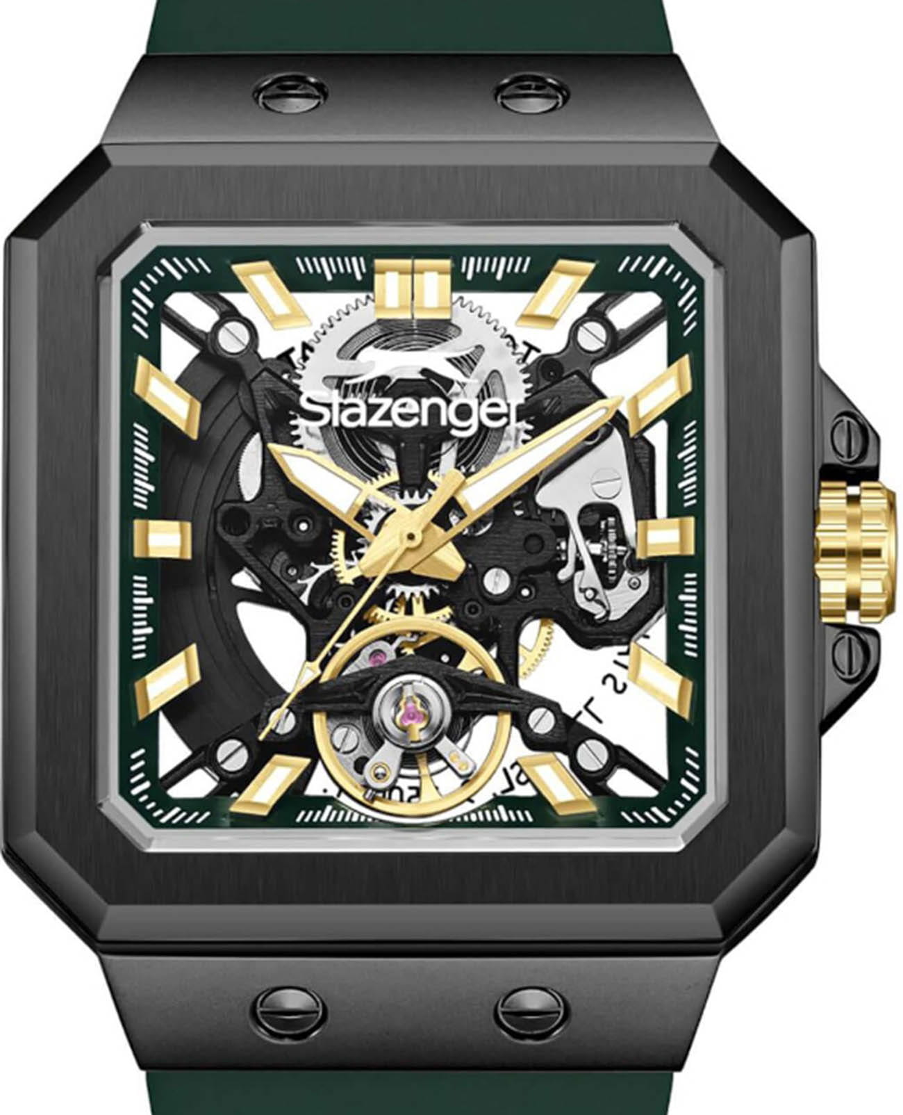 Мужские механические часы с автоподзаводом Slazenger — это выразительный и функциональный аксессуар. Корпус размером 40×51 мм и толщиной 14 мм выполнен из нержавеющей стали 316L с IP-покрытиемIP-покрытиеМетод ионного напыления. Демонстрирует повышенную устойчивость к истиранию, окислению и химическим веществам. Под воздействием высокого давления и температуры около 1500°C молекулы металла надёжно соединяются с частицами корпуса часов.. Циферблат зелёного цвета частично скелетонизирован, что позволяет наблюдать за работой механизма. Циферблат защищён минеральным стекломМинеральное стеклоМинеральное стекло представляет собой искусственно выращенный минерал кварца. Такое стекло отличается особой устойчивостью к повреждениям и царапинам. Уступает по некоторым качествам сапфировому стеклу.. Прозрачная задняя крышка открывает вид на механизм. Стрелки и метки с люминесцентным покрытиемЛюминесцентное покрытиеПозволяет считывать показания времени в темноте. Производители наносят на стрелки, часовые индексы, безель или поверхность циферблата светонакопительный состав, дающий холодное свечение., обеспечивающим хорошую читаемость в темноте. Часы оснащены силиконовым ремешком с стандартной застёжкой. Водонепроницаемость 100 м позволяет использовать часы для плавания и повседневного ношения. Гарантия — 12 месяцев. Идеальный выбор для тех, кто ценит стиль, технологичность и качество.