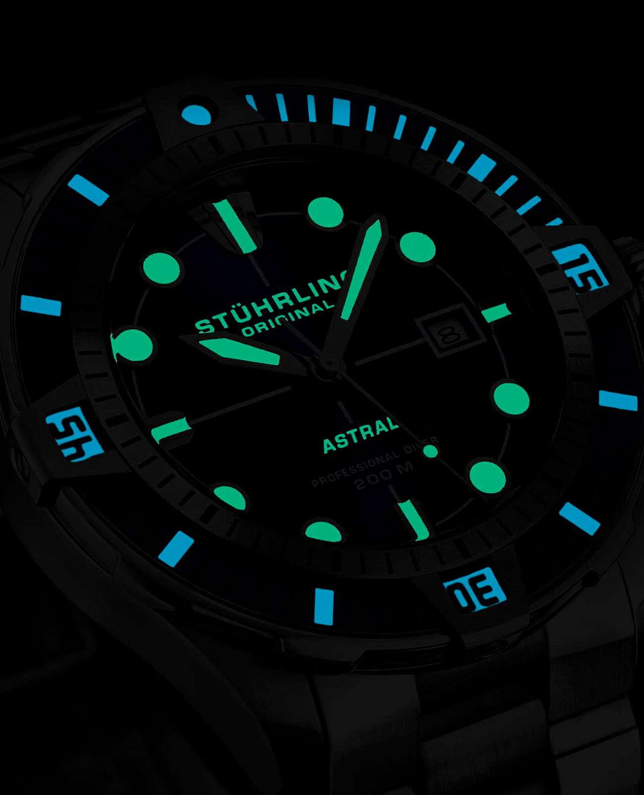 Мужские наручные часы Stuhrling Original 1005.01 из коллекции Aquadiver сочетают в себе надежность и стильный дизайн, идеально подходящий для активного образа жизни. Модель обладает круглым корпусом диаметром 45 мм, изготовленным из нержавеющей стали, что обеспечивает повышенную устойчивость к внешним воздействиям]. БезельБезельВнешний ободок, закрепляющий стекло. В спортивных часах так называется поворотное кольцо с делениями на циферблате, выполняет роль таймера – замеряет отрезки времени на шкале. Неподвижный безель – элемент декора. Однонаправленно вращающийся безель на дайверских часах позволяет фиксировать моменты погружения и выныривания на поверхность. с PVD-покрытиемPVDУльтратонкое покрытие наносится в технике вакуумного напыления, сочетает в себе нитрид титана особой прочности со слоем золота или оксида хрома. Несёт в себе декоративную или защитную функцию.. Браслет выполнен из прочной стали с раскладной застежкойРаскладная застёжкаТакой тип застёжки используется только на браслетах из металла. Она никогда не раскрывается полностью, происходит разделение на 2 и более частей. Раскладывающая застёжка снизит вероятность потери часов к минимуму., гарантирующей комфортное ношение и безопасность. Синий циферблат оснащен люминесцентным покрытиемЛюминесцентное покрытиеПозволяет считывать показания времени в темноте. Производители наносят на стрелки, часовые индексы, безель или поверхность циферблата светонакопительный состав, дающий холодное свечение. стрелок и маркеров, обеспечивающим высокую читаемость даже в условиях плохой видимости под водой]. Для защиты используется стекло KrysternaKrysternaKrysterna — инновационное стекло для наручных часов. Благодаря уникальной структуре, Krysterna объединяет ключевые преимущества двух материалов: твердость сапфира, защищающую от царапин, и гибкость минерального стекла, обеспечивающую устойчивость к деформациям. Такая комбинация делает его идеальным решением для часов, подверженных экстремальным нагрузкам, сохраняя при этом оптическую прозрачность., которое делает его устойчивым к царапинам и бликам]. Часы работают на механическом механизме с автоподзаводом, что гарантирует точное время без необходимости ручного завода]. Модель предлагает множество функций: секундомерСекундомерСекундоме́р — прибор, способный измерять интервалы времени с точностью до долей секунды., таймерТаймерОтсчитывает секунды в обратном направлении в заданном интервале времени. и водонепроницаемость до 200WR, что позволяет использовать их во время плавания и других водных видов спорта, включая дайвинг]. Ударопрочный корпус и эргономичный дизайн делают эти часы идеальным выбором для любителей активного отдыха и профессионалов].