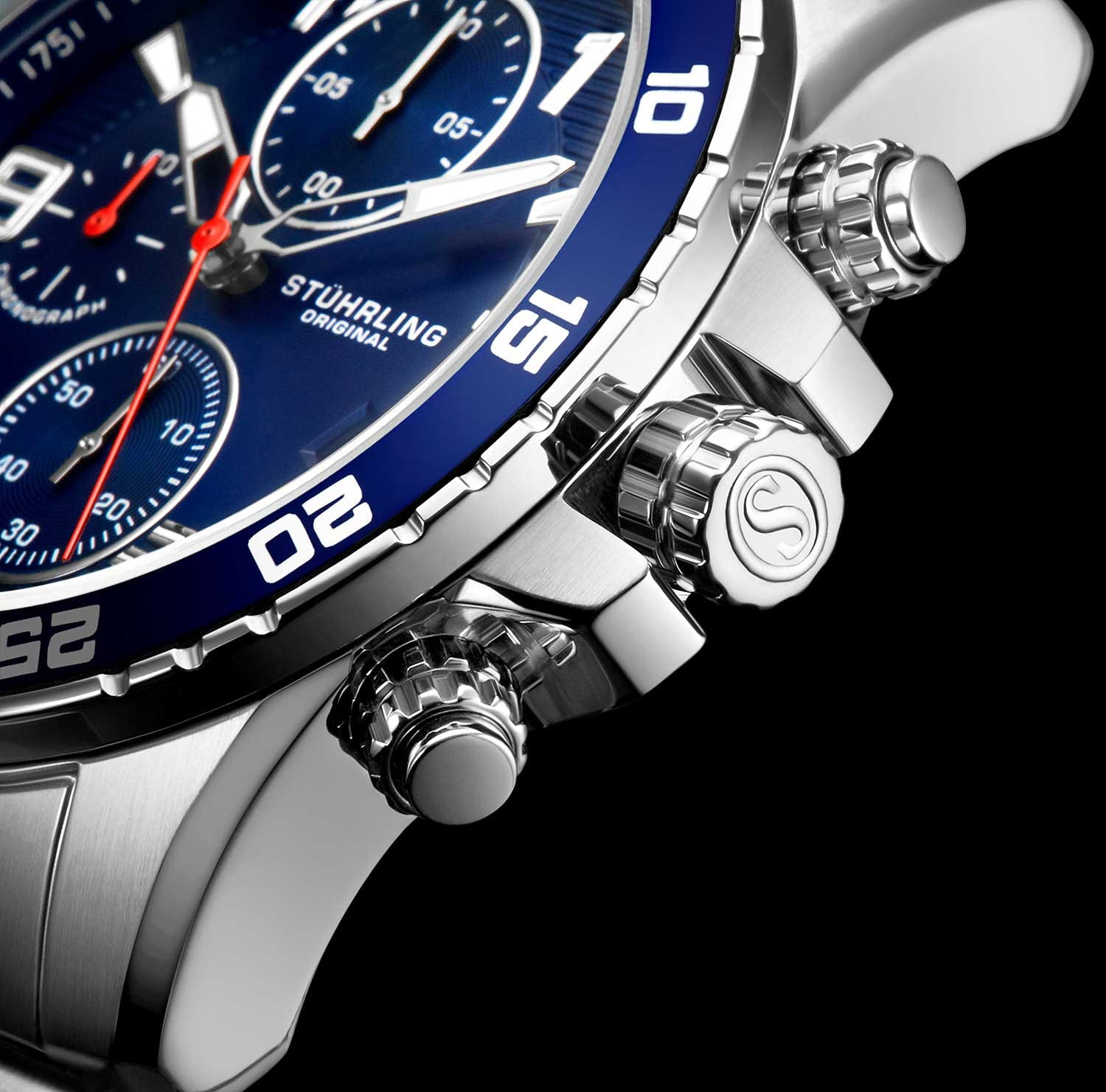Stuhrling 3957.2 — мощные мужские часы с выразительным спортивным характером и динамичным дизайном. Корпус из нержавеющей стали гармонично сочетается с циферблатом, оформленным рельефным узором и контрастными счётчиками хронографаХронографФункция позволяет измерять отрезки времени с особой точностью: часы, минуты, секунды. Верным признаком хронографа является наличие на циферблате 3 дополнительных окошек-счётчиков.. Широкий безельБезельВнешний ободок, закрепляющий стекло. В спортивных часах так называется поворотное кольцо с делениями на циферблате, выполняет роль таймера – замеряет отрезки времени на шкале. Неподвижный безель – элемент декора. Однонаправленно вращающийся безель на дайверских часах позволяет фиксировать моменты погружения и выныривания на поверхность. с PVD-покрытиемPVDУльтратонкое покрытие наносится в технике вакуумного напыления, сочетает в себе нитрид титана особой прочности со слоем золота или оксида хрома. Несёт в себе декоративную или защитную функцию. подчёркивает брутальный стиль модели, а стрелки и метки с люминесцентным покрытиемЛюминесцентное покрытиеПозволяет считывать показания времени в темноте. Производители наносят на стрелки, часовые индексы, безель или поверхность циферблата светонакопительный состав, дающий холодное свечение. обеспечивают идеальную читаемость в любых условиях. Прочное стекло KrysternaKrysternaKrysterna — инновационное стекло для наручных часов. Благодаря уникальной структуре, Krysterna объединяет ключевые преимущества двух материалов: твердость сапфира, защищающую от царапин, и гибкость минерального стекла, обеспечивающую устойчивость к деформациям. Такая комбинация делает его идеальным решением для часов, подверженных экстремальным нагрузкам, сохраняя при этом оптическую прозрачность. устойчиво к царапинам, сохраняя прозрачность и блеск. Завершает образ стальной браслет с раскладной застёжкойРаскладная застёжкаТакой тип застёжки используется только на браслетах из металла. Она никогда не раскрывается полностью, происходит разделение на 2 и более частей. Раскладывающая застёжка снизит вероятность потери часов к минимуму., гарантирующий комфорт и надёжную фиксацию. Stuhrling — стильная и функциональная модель для уверенных мужчин, ценящих точность и энергию в каждой детали.