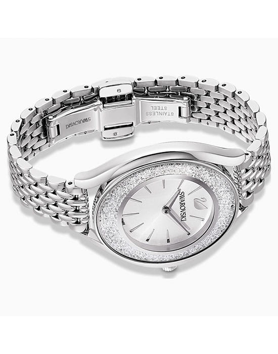 Swarovski 5519462 — элегантные женские часы из коллекции Crystalline, сочетающие изысканный дизайн с высоким качеством. Корпус диаметром 35,5 мм выполнен из нержавеющей стали. Минеральное стеклоМинеральное стеклоМинеральное стекло представляет собой искусственно выращенный минерал кварца. Такое стекло отличается особой устойчивостью к повреждениям и царапинам. Уступает по некоторым качествам сапфировому стеклу. защищает циферблат от царапин и повреждений. Более 1300 кристаллов Swarovski украшают корпус, создавая ослепительный блеск. Серебристый циферблат с изящными метками и стрелками подчёркивает утончённость дизайна. Логотип Swarovski в виде лебедя расположен на отметке «12 часов», добавляя уникальности. Часы оснащены швейцарским кварцевым механизмом, обеспечивающим высокую точность хода. Браслет из нержавеющей стали гарантирует комфортное ношение. Застёжка-бабочка с кнопкамиЗастёжка "бабочка"Такой вид застёжки дополняется предохранителями, помогающими избежать случайного раскрытия браслета. Обладают изящным исполнением. обеспечивает надёжную фиксацию на запястье. Водозащита до 5 ATM (50 метров) делает часы подходящими для повседневного использования. Swarovski 5519462 — идеальный выбор для женщин, ценящих элегантность и блеск.