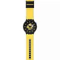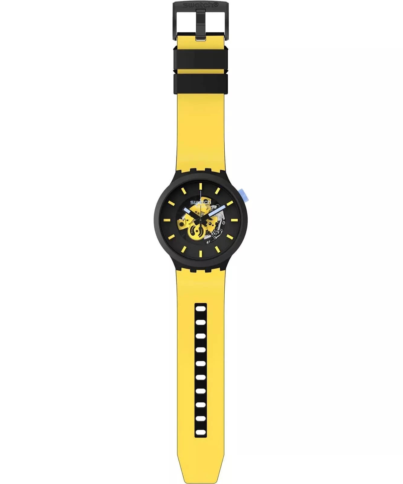 Часы Swatch SB03B109 — это стильный и современный аксессуар для тех, кто ценит лёгкость и комфорт. Часы идеально подойдут как для мужчин, так и для женщин. Центральный элемент этой модели часов — большой корпус со стеклом из био-материала, украшенный 3D-циферблатом с принтами на индексах. Корпус из биокерамикиБиокерамикаБиокерамика — это материал, который на две трети состоит из керамики, на одну треть — из биопластика. Он сочетает в себе лучшие качества обоих материалов и обладает прочностью и шелковистой на ощупь текстурой., а также силиконовые тренчики подчеркивают желтый принт на силиконовом ремешке этих огромных часов. На часовую, минутную стрелки нанесено люминесцентное покрытиеЛюминесцентное покрытиеПозволяет считывать показания времени в темноте. Производители наносят на стрелки, часовые индексы, безель или поверхность циферблата светонакопительный состав, дающий холодное свечение., которое светится в темноте, создавая необычное изображение. Водозащита 30 метров делает часы практичными для повседневного использования. Эти часы подойдут для повседневного ношения и станут ярким акцентом в вашем наряде.