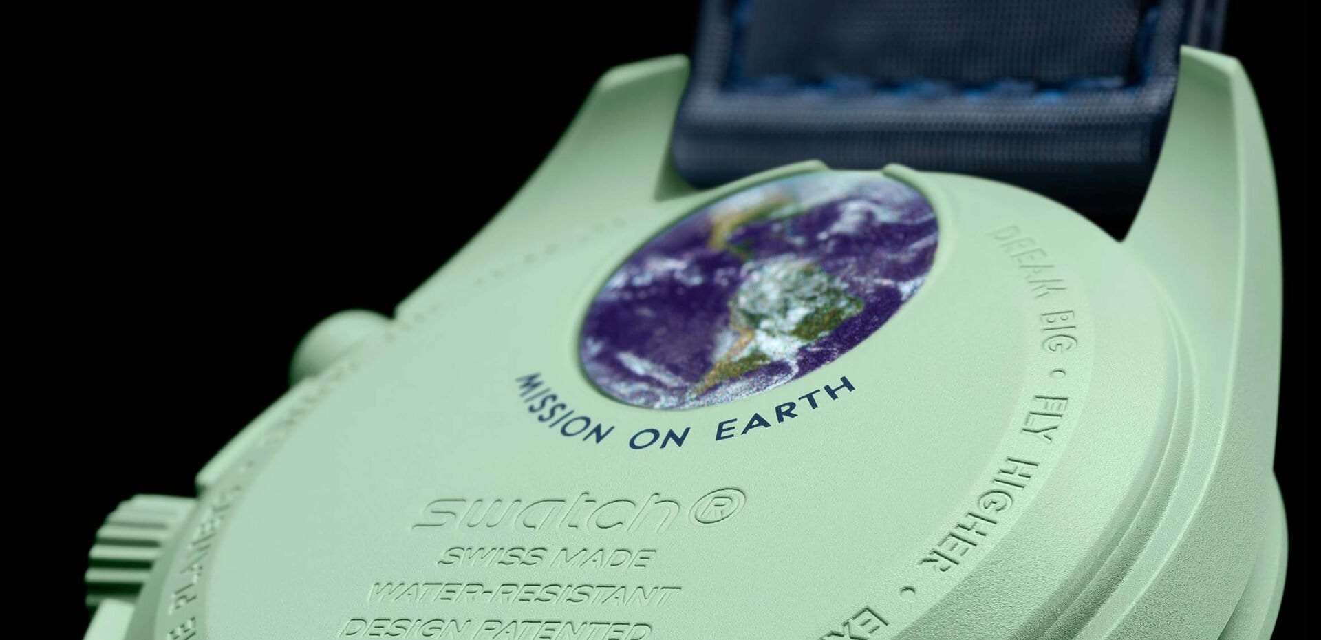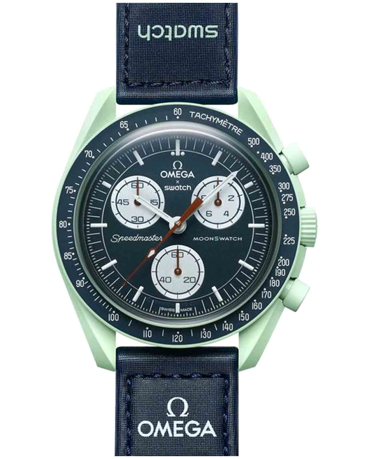 Часы Swatch Bioceramic Moonswatch MISSION ON EARTH SO33G100 — это стильный и современный аксессуар для тех, кто ценит лёгкость и комфорт. Корпус диаметром 42 мм и пряжка этих уникальных часов изготовлены из биокерамикиБиокерамикаБиокерамика — это материал, который на две трети состоит из керамики, на одну треть — из биопластика. Он сочетает в себе лучшие качества обоих материалов и обладает прочностью и шелковистой на ощупь текстурой., а также ремешок VELCRO®. Модель оснащена синим циферблатом и биокерамическим безелемБезельВнешний ободок, закрепляющий стекло. В спортивных часах так называется поворотное кольцо с делениями на циферблате, выполняет роль таймера – замеряет отрезки времени на шкале. Неподвижный безель – элемент декора. Однонаправленно вращающийся безель на дайверских часах позволяет фиксировать моменты погружения и выныривания на поверхность. на который нанесена шкала тахиметраТахиметрРазмеченная шкала, располагается на ободке или безеле часов. Тахиметр позволяет рассчитать скорость на определённом участке пути, расстояние измеряется в километрах или милях.. Общими характеристиками всех часов в данной коллекции являются конструкция стекла из биоматериала, «скрытая» в центре кристалла буква "S", тонкий и изящный круговой узор на внешнем кольце циферблата и заглубленных мини-циферблатах, гладкие ушки с заостренными концами, культовая точка над отметкой 90 на тахиметрической шкале безеля и, конечно же, уникальный материал – биокерамика. Индексы, часовая, минутная и секундная стрелки хронографаХронографФункция позволяет измерять отрезки времени с особой точностью: часы, минуты, секунды. Верным признаком хронографа является наличие на циферблате 3 дополнительных окошек-счётчиков. покрыты люминесцентным покрытиемЛюминесцентное покрытиеПозволяет считывать показания времени в темноте. Производители наносят на стрелки, часовые индексы, безель или поверхность циферблата светонакопительный состав, дающий холодное свечение. Super-LumiNova® класса А, благодаря чему они светятся в темноте. Циферблаты каждых часов в данной коллекции украшены фирменным знаком OMEGA X Swatch, культовым логотипом Speedmaster и логотипом MoonSwatch.