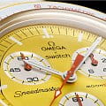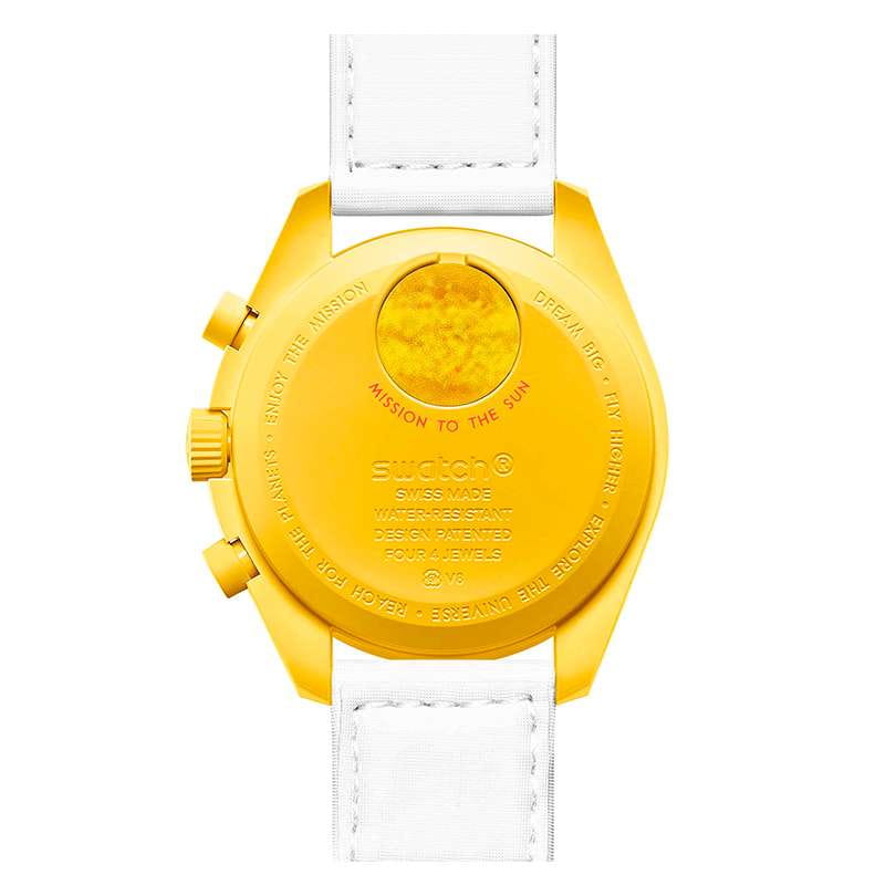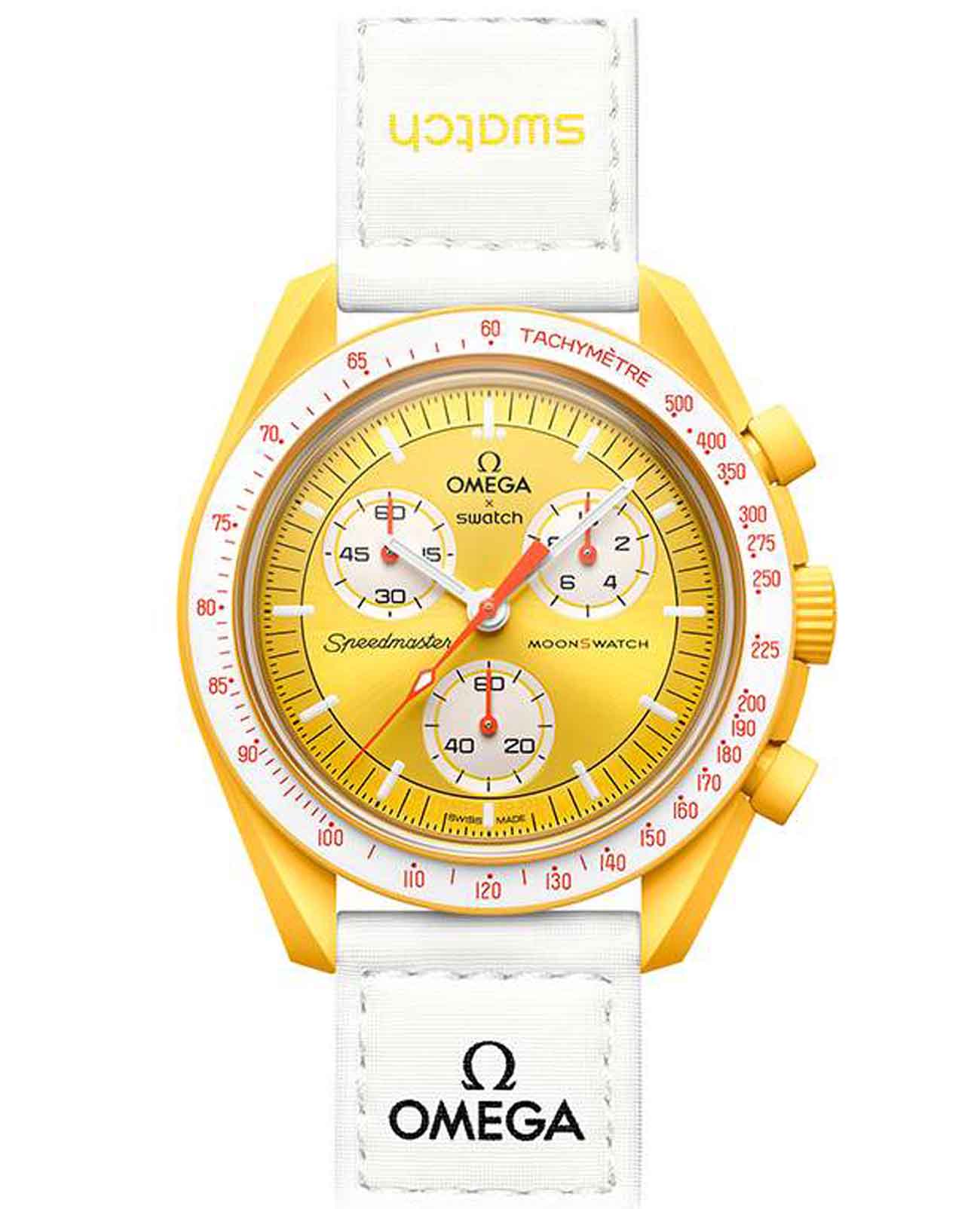 Часы Swatch Bioceramic Moonswatch MISSION TO THE SUN SO33J100 — это стильный и современный аксессуар для тех, кто ценит лёгкость и комфорт. Корпус диаметром 42 мм и пряжка этих уникальных часов изготовлены из биокерамикиБиокерамикаБиокерамика — это материал, который на две трети состоит из керамики, на одну треть — из биопластика. Он сочетает в себе лучшие качества обоих материалов и обладает прочностью и шелковистой на ощупь текстурой., а также ремешок VELCRO®. Модель оснащена желтым циферблатом и белым биокерамическим безелемБезельВнешний ободок, закрепляющий стекло. В спортивных часах так называется поворотное кольцо с делениями на циферблате, выполняет роль таймера – замеряет отрезки времени на шкале. Неподвижный безель – элемент декора. Однонаправленно вращающийся безель на дайверских часах позволяет фиксировать моменты погружения и выныривания на поверхность. на который нанесена шкала тахиметраТахиметрРазмеченная шкала, располагается на ободке или безеле часов. Тахиметр позволяет рассчитать скорость на определённом участке пути, расстояние измеряется в километрах или милях.. Общими характеристиками всех часов в данной коллекции являются конструкция стекла из биоматериала, «скрытая» в центре кристалла буква "S", тонкий и изящный круговой узор на внешнем кольце циферблата и заглубленных мини-циферблатах, гладкие ушки с заостренными концами, культовая точка над отметкой 90 на тахиметрической шкале безеля и, конечно же, уникальный материал – биокерамика. Индексы, часовая, минутная и секундная стрелки хронографаХронографФункция позволяет измерять отрезки времени с особой точностью: часы, минуты, секунды. Верным признаком хронографа является наличие на циферблате 3 дополнительных окошек-счётчиков. покрыты люминесцентным покрытиемЛюминесцентное покрытиеПозволяет считывать показания времени в темноте. Производители наносят на стрелки, часовые индексы, безель или поверхность циферблата светонакопительный состав, дающий холодное свечение. Super-LumiNova® класса А, благодаря чему они светятся в темноте. Циферблаты каждых часов в данной коллекции украшены фирменным знаком OMEGA X Swatch, культовым логотипом Speedmaster и логотипом MoonSwatch.