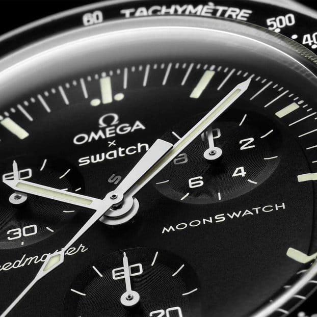 Часы Swatch Bioceramic Moonswatch MISSION TO THE MOON SO33M100 — это стильный и современный аксессуар для тех, кто ценит лёгкость и комфорт. Корпус диаметром 42 мм и пряжка этих уникальных часов изготовлены из биокерамикиБиокерамикаБиокерамика — это материал, который на две трети состоит из керамики, на одну треть — из биопластика. Он сочетает в себе лучшие качества обоих материалов и обладает прочностью и шелковистой на ощупь текстурой., а также ремешок VELCRO®. Модель оснащена черным циферблатом и черным биокерамическим безелемБезельВнешний ободок, закрепляющий стекло. В спортивных часах так называется поворотное кольцо с делениями на циферблате, выполняет роль таймера – замеряет отрезки времени на шкале. Неподвижный безель – элемент декора. Однонаправленно вращающийся безель на дайверских часах позволяет фиксировать моменты погружения и выныривания на поверхность. на который нанесена шкала тахиметраТахиметрРазмеченная шкала, располагается на ободке или безеле часов. Тахиметр позволяет рассчитать скорость на определённом участке пути, расстояние измеряется в километрах или милях.. Общими характеристиками всех часов в данной коллекции являются конструкция стекла из биоматериала, «скрытая» в центре кристалла буква "S", тонкий и изящный круговой узор на внешнем кольце циферблата и заглубленных мини-циферблатах, гладкие ушки с заостренными концами, культовая точка над отметкой 90 на тахиметрической шкале безеля и, конечно же, уникальный материал – биокерамика. Индексы, часовая, минутная и секундная стрелки хронографаХронографФункция позволяет измерять отрезки времени с особой точностью: часы, минуты, секунды. Верным признаком хронографа является наличие на циферблате 3 дополнительных окошек-счётчиков. покрыты люминесцентным покрытиемЛюминесцентное покрытиеПозволяет считывать показания времени в темноте. Производители наносят на стрелки, часовые индексы, безель или поверхность циферблата светонакопительный состав, дающий холодное свечение. Super-LumiNova® класса А, благодаря чему они светятся в темноте. Циферблаты каждых часов в данной коллекции украшены фирменным знаком OMEGA X Swatch, культовым логотипом Speedmaster и логотипом MoonSwatch.