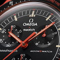 Часы Swatch Bioceramic Moonswatch MISSION ON EARTH - LAVA SO33O100 — это стильный и современный аксессуар для тех, кто ценит лёгкость и комфорт. Корпус диаметром 42 мм и пряжка этих уникальных часов изготовлены из биокерамикиБиокерамикаБиокерамика — это материал, который на две трети состоит из керамики, на одну треть — из биопластика. Он сочетает в себе лучшие качества обоих материалов и обладает прочностью и шелковистой на ощупь текстурой.. Модель оснащена черным циферблатом и черным биокерамическим безелемБезельВнешний ободок, закрепляющий стекло. В спортивных часах так называется поворотное кольцо с делениями на циферблате, выполняет роль таймера – замеряет отрезки времени на шкале. Неподвижный безель – элемент декора. Однонаправленно вращающийся безель на дайверских часах позволяет фиксировать моменты погружения и выныривания на поверхность. с нанесенной на него шкалой тахиметраТахиметрРазмеченная шкала, располагается на ободке или безеле часов. Тахиметр позволяет рассчитать скорость на определённом участке пути, расстояние измеряется в километрах или милях., а также черным ремешком с липучкой VELCRO®. Часовые отметки, часовая и минутная стрелки, а также кончик секундной стрелки хронографаХронографФункция позволяет измерять отрезки времени с особой точностью: часы, минуты, секунды. Верным признаком хронографа является наличие на циферблате 3 дополнительных окошек-счётчиков. покрыты люминесцентным покрытиемЛюминесцентное покрытиеПозволяет считывать показания времени в темноте. Производители наносят на стрелки, часовые индексы, безель или поверхность циферблата светонакопительный состав, дающий холодное свечение. Super-LumiNova® класса А, благодаря чему они прекрасно светятся в темноте. На циферблатах всех часов данной коллекции присутствуют логотип OMEGA X Swatch, культовый логотип Speedmaster и логотип MoonSwatch. Общими характеристиками всех моделей являются объемная конструкция стекла из биоматериала с выгравированной по центру буквой «S», тонкий и изящный круговой узор на внешнем кольце циферблата и заглубленных мини-циферблатах, гладкие ушки с заостренными концами, культовая точка над отметкой 90 на тахиметрической шкале и, конечно же, уникальный материал – биокерамика.