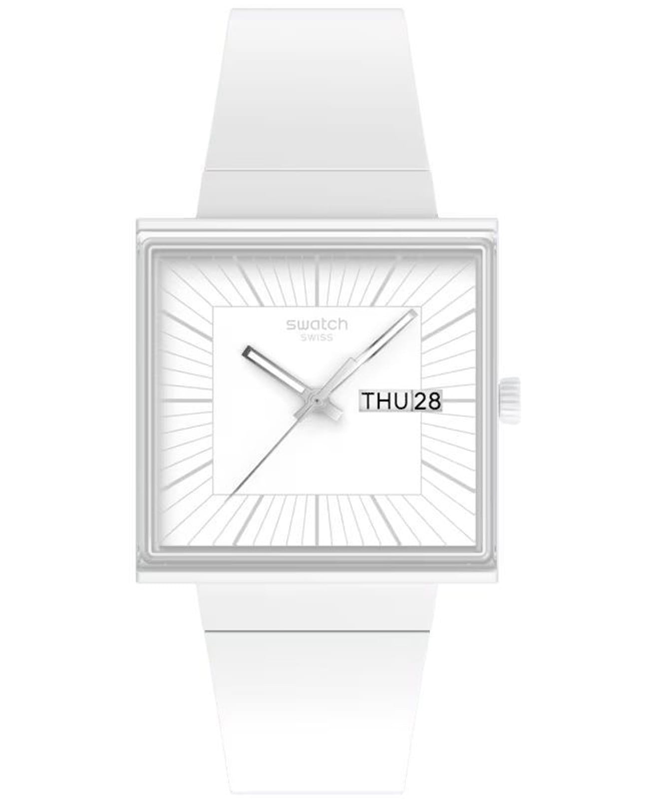 Swatch Square Bioceramic Standard SO34W700 "WHAT IF...ALLWHITE?" - это стильные квадратные часы с корпусом 41,8*41,8 мм из матовой биокерамики белого цвета. Модель оснащена кварцевым механизмом, окошком даты и дня недели, водонепроницаемостью до 20 метров. Часы имеют белый матовый ремешок из биоматериала, белый циферблат и стекло из биоматериала. Стрелки с люминесцентным покрытиемЛюминесцентное покрытиеПозволяет считывать показания времени в темноте. Производители наносят на стрелки, часовые индексы, безель или поверхность циферблата светонакопительный состав, дающий холодное свечение.. Эта экологичная модель унисекс сочетает инновационные материалы с необычным полностью белым дизайном с серебристыми индексами и стрелками, вдохновленным оригинальным Swatch 1983 года, и подходит для тех, кто ценит минимализм и заботу об окружающей среде.