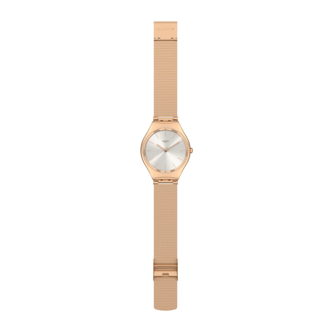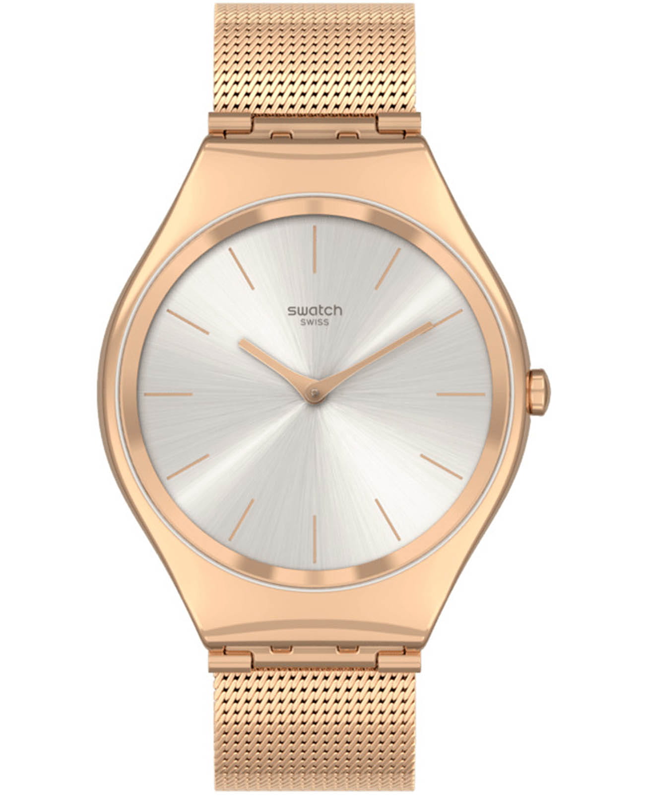 Часы Swatch SYXG120M — это стильный и современный аксессуар для тех, кто ценит лёгкость и комфорт. Часы идеально подойдут как для мужчин, так и для женщин. Эта тонкая модель часов изготовлена из полированной нержавеющей стали с PVDPVDУльтратонкое покрытие наносится в технике вакуумного напыления, сочетает в себе нитрид титана особой прочности со слоем золота или оксида хрома. Несёт в себе декоративную или защитную функцию. покрытием цвета розового золота — на корпусе и ремешке с раскладным замкомРаскладной замокДанный вариант застежки используется только на часах с металлическим браслетом. Отличительная особенность такого крепления в том, что длина браслета становится универсальной и вы можете самостоятельно отрегулировать нужный вам размер – застежка просто двигается по браслету часов.. Серебристый циферблат с радиальной полировкой и стрелками цвета розового золота придают этим тонким часам изящную притягательность. Водозащита 30 метров делает часы практичными для повседневного использования. Эти часы подойдут для повседневного ношения и станут ярким акцентом в вашем наряде.
