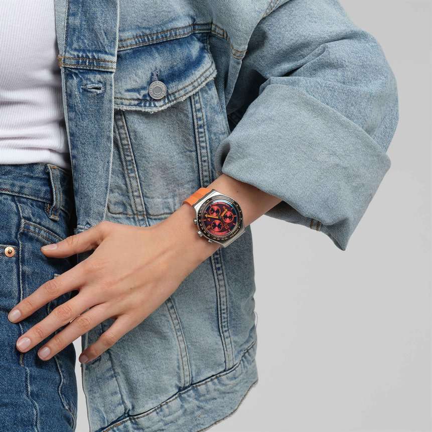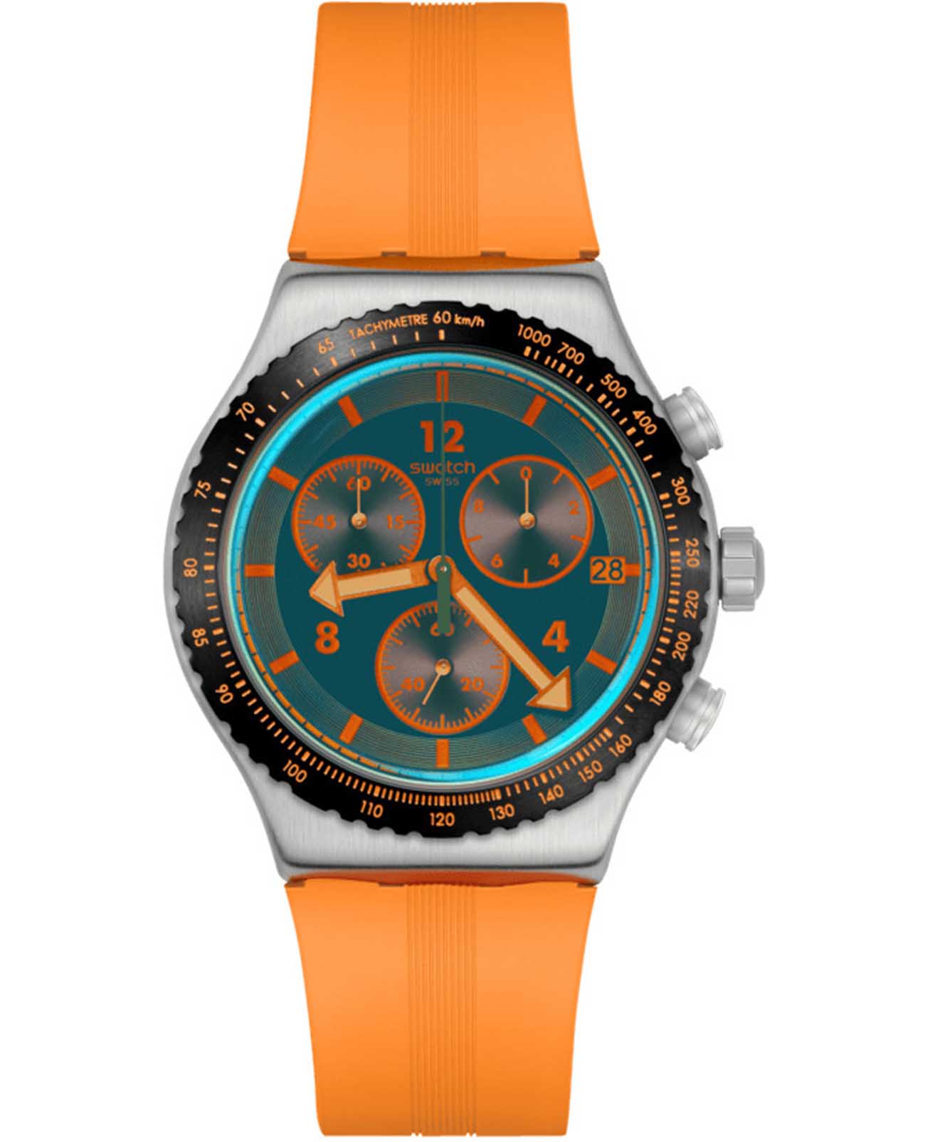 Часы Swatch YVS529 — это стильный и современный аксессуар для тех, кто ценит лёгкость и комфорт. Этот хронографХронографФункция позволяет измерять отрезки времени с особой точностью: часы, минуты, секунды. Верным признаком хронографа является наличие на циферблате 3 дополнительных окошек-счётчиков. из нержавеющей стали имеет синий циферблат с оранжевым принтом. Часовая и минутная стрелки серебристой расцветки, а также синяя секундная стрелка светятся в темноте из-за люминесцентного покрытияЛюминесцентное покрытиеПозволяет считывать показания времени в темноте. Производители наносят на стрелки, часовые индексы, безель или поверхность циферблата светонакопительный состав, дающий холодное свечение.. Часы заключены в матовый стальной корпус, оснащены стальным безелемБезельВнешний ободок, закрепляющий стекло. В спортивных часах так называется поворотное кольцо с делениями на циферблате, выполняет роль таймера – замеряет отрезки времени на шкале. Неподвижный безель – элемент декора. Однонаправленно вращающийся безель на дайверских часах позволяет фиксировать моменты погружения и выныривания на поверхность. с черным PVDPVDУльтратонкое покрытие наносится в технике вакуумного напыления, сочетает в себе нитрид титана особой прочности со слоем золота или оксида хрома. Несёт в себе декоративную или защитную функцию. покрытием и шкалой тахиметраТахиметрРазмеченная шкала, располагается на ободке или безеле часов. Тахиметр позволяет рассчитать скорость на определённом участке пути, расстояние измеряется в километрах или милях.. Модель дополнена броским оранжевым ремешком с тренчиками в тон и блестящей стальной полупряжкой. Водозащита 30 метров делает часы практичными для повседневного использования. Эти часы подойдут для повседневного ношения и станут ярким акцентом в вашем наряде.
