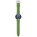 Часы Swatch YVS531 — это стильный и современный аксессуар для тех, кто ценит лёгкость и комфорт. Этот стальной хронографХронографФункция позволяет измерять отрезки времени с особой точностью: часы, минуты, секунды. Верным признаком хронографа является наличие на циферблате 3 дополнительных окошек-счётчиков. оснащен синим циферблатом с радиальной полировкой, черными дополнительными циферблатами, белыми цифрами, светящимися в темноте часовыми индексами из-за люминесцентного покрытияЛюминесцентное покрытиеПозволяет считывать показания времени в темноте. Производители наносят на стрелки, часовые индексы, безель или поверхность циферблата светонакопительный состав, дающий холодное свечение., а также белым окошком календаря с черным принтом в районе отметки 3 часа. Отсчет времени ведут остроконечные часовая и минутная стрелки серебристой расцветки, светящиеся в темноте из-за люминесцентного покрытияЛюминесцентное покрытиеПозволяет считывать показания времени в темноте. Производители наносят на стрелки, часовые индексы, безель или поверхность циферблата светонакопительный состав, дающий холодное свечение., а также зеленая секундная стрелка хронографаХронографФункция позволяет измерять отрезки времени с особой точностью: часы, минуты, секунды. Верным признаком хронографа является наличие на циферблате 3 дополнительных окошек-счётчиков.. Часы заключены в матовый стальной корпус, на безельБезельВнешний ободок, закрепляющий стекло. В спортивных часах так называется поворотное кольцо с делениями на циферблате, выполняет роль таймера – замеряет отрезки времени на шкале. Неподвижный безель – элемент декора. Однонаправленно вращающийся безель на дайверских часах позволяет фиксировать моменты погружения и выныривания на поверхность. с черным PVDPVDУльтратонкое покрытие наносится в технике вакуумного напыления, сочетает в себе нитрид титана особой прочности со слоем золота или оксида хрома. Несёт в себе декоративную или защитную функцию. покрытием нанесена белая шкала тахиметраТахиметрРазмеченная шкала, располагается на ободке или безеле часов. Тахиметр позволяет рассчитать скорость на определённом участке пути, расстояние измеряется в километрах или милях.. Модель дополнена структурированным матово-зеленым ремешком с тренчиками в тон и матовой полупряжкой из стали. Водозащита 30 метров делает часы практичными для повседневного использования. Эти часы подойдут для повседневного ношения и станут ярким акцентом в вашем наряде.