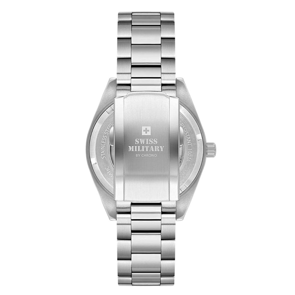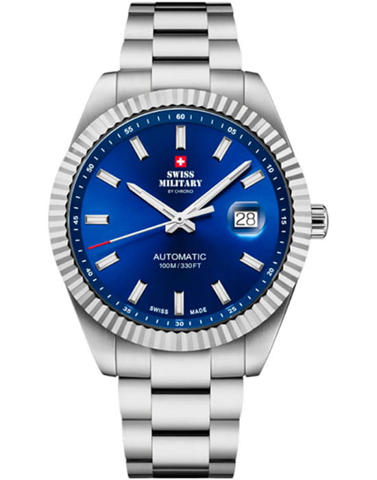 Мужские механические швейцарские часы с автоподзаводом Swiss Military by Chrono Automatic Collection SMA34110.03 — это элегантный мужской аксессуар, сочетающий швейцарское качество и классический дизайн. Корпус диаметром 40 мм и браслет выполнены из нержавеющей стали, придающим изделию изысканный вид. Сапфировое стеклоСапфировое стеклоПрочный и надёжный материал из кристалла сапфира синтетического происхождения, характеризующийся особой твёрдостью и устойчивостью к царапинам и повреждениям. устойчивое к появлению царапин, обладающее высокой прозрачностью.  Стрелки и часовые метки покрыты люминесцентным составомЛюминесцентное покрытиеПозволяет считывать показания времени в темноте. Производители наносят на стрелки, часовые индексы, безель или поверхность циферблата светонакопительный состав, дающий холодное свечение., обеспечивая отличную читаемость в условиях низкой освещённости. Окошко даты находится в положении 3 часов. Браслет из нержавеющей стали с раскладной застёжкойРаскладная застёжкаТакой тип застёжки используется только на браслетах из металла. Она никогда не раскрывается полностью, происходит разделение на 2 и более частей. Раскладывающая застёжка снизит вероятность потери часов к минимуму. обеспечивает комфортное ношение и надёжную фиксацию на запястье. Водонепроницаемость до 10 ATM позволяет использовать часы при плавании и других водных активностях. Swiss Military — это идеальный выбор для мужчин, ценящих сочетание элегантности, функциональности и швейцарского качества.