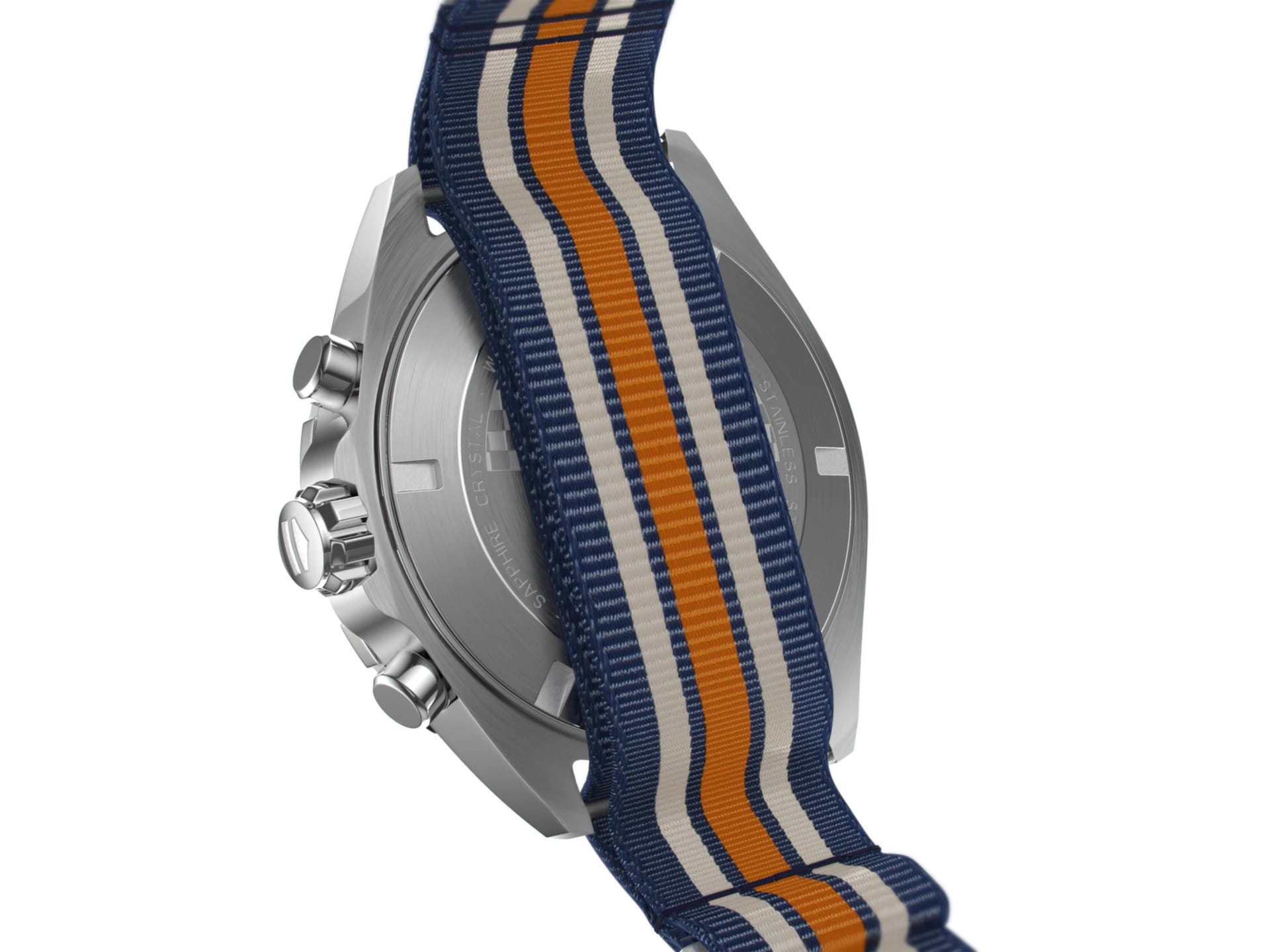 43-мм спортивный хронограф с синим циферблатом, синим безелем с тахиметрической шкалой из алюминия с микроструйной обработкой и классической конфигурацией счетчиков 3-6-9. Актуальный ремешок NATO такого же оттенка синего с центральной оранжевой и двумя тонкими серыми полосками. TAG Heuer Formula 1 CAZ1014.FC8196, кварцевый механизм с высокой точностью. Сапфировое стекло устойчивое к появлению царапин, обладающее высокой прозрачностью. Класс водозащиты: 200 метров, позволит плавать, нырять и заниматься другими водными видами спорта. Корпус часов изготовлен из стали, цвета.