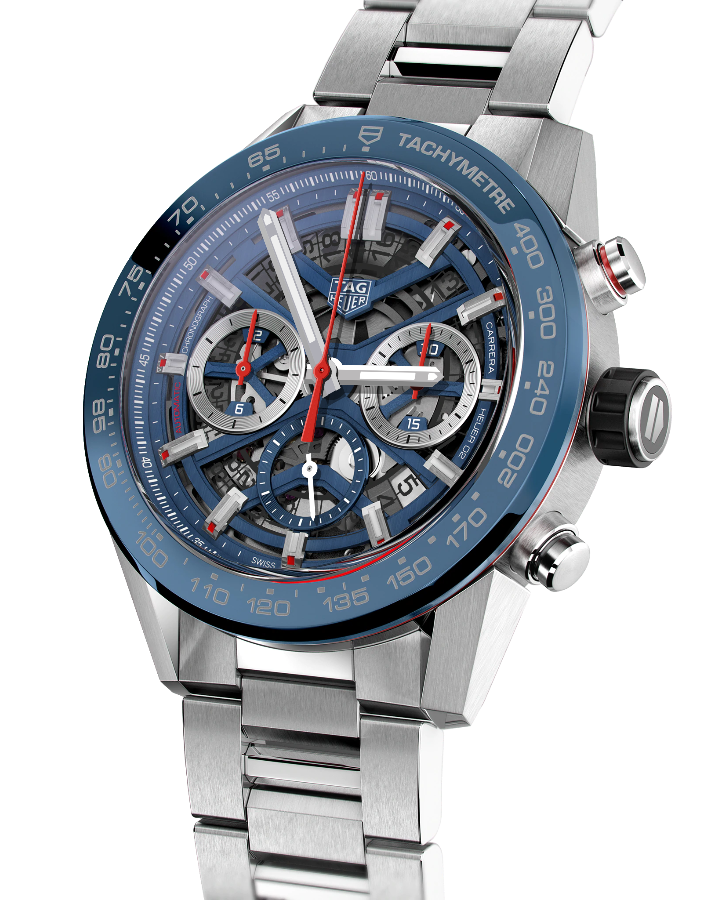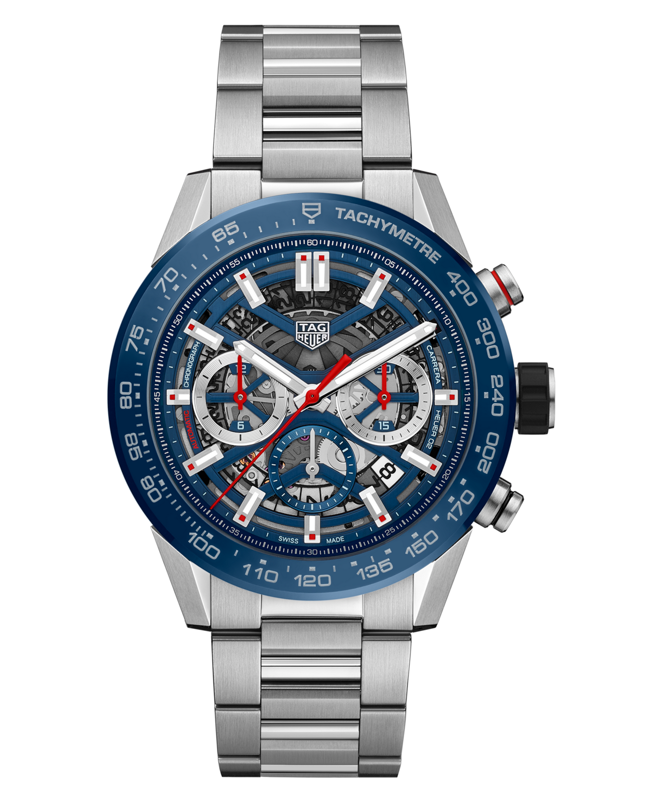 Часы TAG Heuer Carrera диаметром 45 мм имеют корпус из нержавеющей стали и синий циферблат с неподвижным керамическим безелем синего цвета. Изысканный скелетонизированный циферблат позволяет рассмотреть мануфактурный калибр. TAG Heuer Carrera CBG2A11.BA0654, механический механизм (автоматический калибр) с высокой точностью. Сапфировое стекло устойчивое к появлению царапин, обладающее высокой прозрачностью. Класс водозащиты: 100 метров, позволит плавать, нырять и заниматься другими водными видами спорта. Корпус часов изготовлен из стали, цвета.