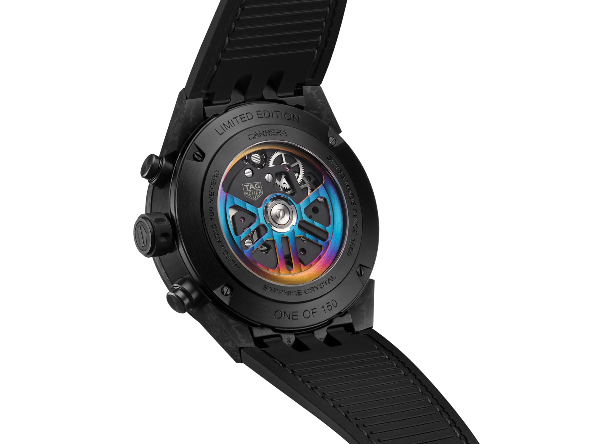 Мужские часы-хронографХронографФункция позволяет измерять отрезки времени с особой точностью: часы, минуты, секунды. Верным признаком хронографа является наличие на циферблате 3 дополнительных окошек-счётчиков. Tag Heuer Carrera Polychrome CAR5A8AF.FC6415. Корпус из черного титана и карбоновый безель идеально обрамляют шикарный радужный циферблат этих технологичных часов, выпущенных ограниченным тиражом в 150 экземпляров. Благодаря оригинальному PVDPVDУльтратонкое покрытие наносится в технике вакуумного напыления, сочетает в себе нитрид титана особой прочности со слоем золота или оксида хрома. Несёт в себе декоративную или защитную функцию.-покрытию циферблат часов имеет безошибочно узнаваемый оттенок радужного опала. Механический механизм (автоматический калибр) с высокой точностью. Сапфировое стеклоСапфировое стеклоПрочный и надёжный материал из кристалла сапфира синтетического происхождения, характеризующийся особой твёрдостью и устойчивостью к царапинам и повреждениям. устойчивое к появлению царапин, обладающее высокой прозрачностью. Стрелки с люминесцентным покрытиемЛюминесцентное покрытиеПозволяет считывать показания времени в темноте. Производители наносят на стрелки, часовые индексы, безель или поверхность циферблата светонакопительный состав, дающий холодное свечение.. Класс водозащиты: 100 метров, позволит плавать, нырять и заниматься другими водными видами спорта. Корпус выполнен из матового титана с черным PVD покрытием, крепления и безель выполнены из карбона. Ремешок с раскладной застёжкойРаскладная застёжкаТакой тип застёжки используется только на браслетах из металла. Она никогда не раскрывается полностью, происходит разделение на 2 и более частей. Раскладывающая застёжка снизит вероятность потери часов к минимуму.