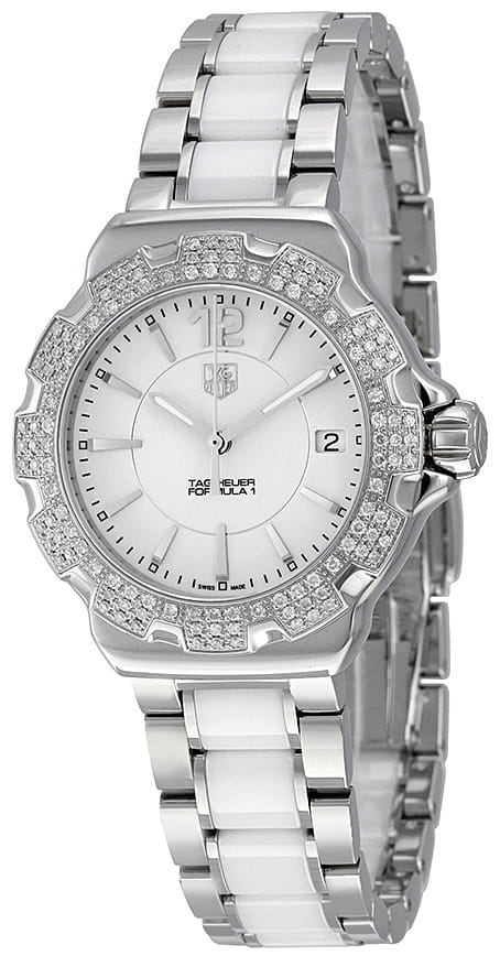 Швейцарские женские часы TAG Heuer Formula 1 — это воплощение элегантности, роскоши и точности. Модель WAH1218.BA0861 из коллекции Formula 1 вдохновлена миром автоспорта, сочетая в себе динамику, выносливость и безупречный стиль. Корпус выполнен из высококачественной нержавеющей стали 316L и керамики, что обеспечивает долговечность и устойчивость к внешним воздействиям. Циферблат с эффектом sunray добавляет модели особую привлекательность и элегантность. Циферблат защищен прочным сапфировым стекломСапфировое стеклоПрочный и надёжный материал из кристалла сапфира синтетического происхождения, характеризующийся особой твёрдостью и устойчивостью к царапинам и повреждениям., которое не царапается при механическом воздействии и гарантирует четкую видимость показаний в любых условиях. Безель декорирован бриллиантами, что делает модель особенно роскошной и премиальной. Окошко даты расположено в удобном месте на циферблате, добавляя функциональности. Механизм часов кварцевый, что гарантирует исключительную точность хода. Водозащита до 20 атм (WR200) делает эти часы подходящими для плавания и других водных видов спорта. Браслет из нержавеющей стали и керамики оснащен надежной раскладывающейся застежкой с кнопками Раскладная застёжкаТакой тип застёжки используется только на браслетах из металла. Она никогда не раскрывается полностью, происходит разделение на 2 и более частей. Раскладывающая застёжка снизит вероятность потери часов к минимуму., обеспечивающей комфортную фиксацию на запястье.