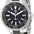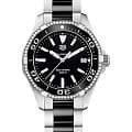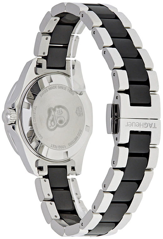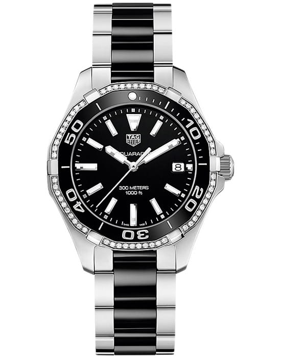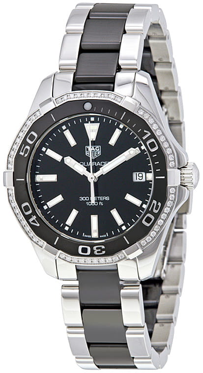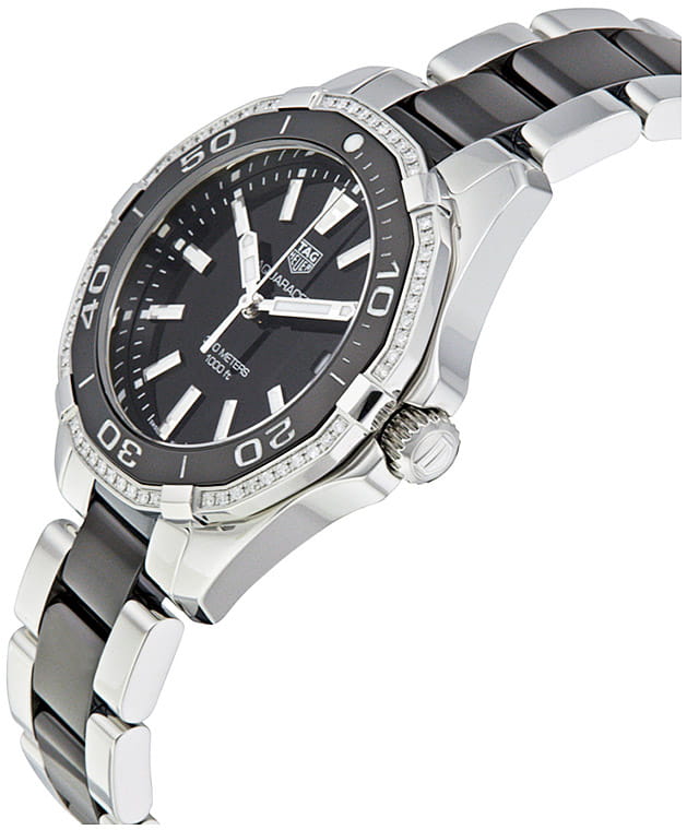 TAG Heuer Aquaracer WAY131G.BA0913 — элегантные женские часы, сочетающие стиль и функциональность. Корпус диаметром 35 мм и толщиной 10,75 мм выполнен из полированной нержавеющей стали, обеспечивая долговечность и устойчивость к коррозии. Чёрный лакированный циферблат оснащён накладными часовыми метками и стрелками с люминесцентным покрытиемЛюминесцентное покрытиеПозволяет считывать показания времени в темноте. Производители наносят на стрелки, часовые индексы, безель или поверхность циферблата светонакопительный состав, дающий холодное свечение., обеспечивающим отличную читаемость в любых условиях освещения. Его поверхность защищена сапфировым стекломСапфировое стеклоПрочный и надёжный материал из кристалла сапфира синтетического происхождения, характеризующийся особой твёрдостью и устойчивостью к царапинам и повреждениям., устойчивым к царапинам. Часы оснащены точным кварцевым механизмом, обеспечивающим стабильное отображение времени. Функциональность включает индикацию часов, минут, секунд и даты, расположенной на отметке «3 часа». БезельБезельВнешний ободок, закрепляющий стекло. В спортивных часах так называется поворотное кольцо с делениями на циферблате, выполняет роль таймера – замеряет отрезки времени на шкале. Неподвижный безель – элемент декора. Однонаправленно вращающийся безель на дайверских часах позволяет фиксировать моменты погружения и выныривания на поверхность. однонаправленный вращающийся, выполнен из стали и чёрной керамики, устойчивой к царапинам и украшен 60 бриллиантами. Водозащита до 300 метров (30 бар) делает модель подходящей для дайвинга и активного образа жизни. Браслет комбинированный, выполнен из полированной нержавеющей стали и чёрной керамики, оснащён застёжкой-бабочкой с кнопкамиЗастёжка "бабочка"Такой вид застёжки дополняется предохранителями, помогающими избежать случайного раскрытия браслета. Обладают изящным исполнением. .с кнопками для дополнительной безопасности.
