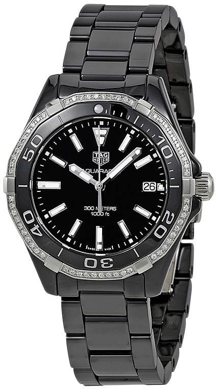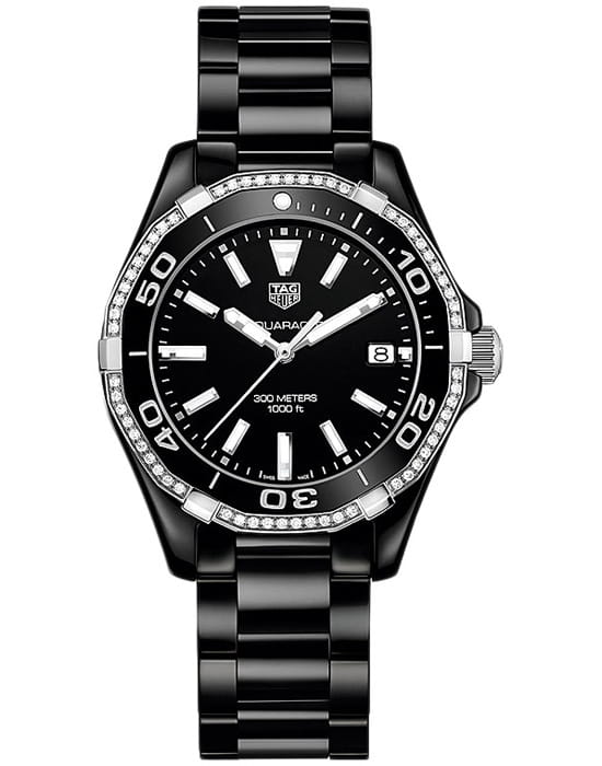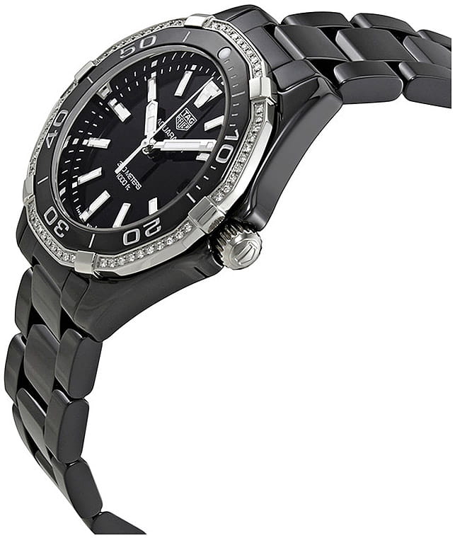 TAG Heuer Aquaracer WAY1395.BH0716 — элегантные женские часы, сочетающие стиль и функциональность. Корпус диаметром 35 мм выполнен из стали с чёрной матовой керамикой, обеспечивающей лёгкость и устойчивость к царапинам. Чёрный циферблат оснащён накладными часовыми метками и стрелками с люминесцентным покрытиемЛюминесцентное покрытиеПозволяет считывать показания времени в темноте. Производители наносят на стрелки, часовые индексы, безель или поверхность циферблата светонакопительный состав, дающий холодное свечение., обеспечивающим отличную читаемость в любых условиях освещения. Часы оснащены точным кварцевым механизмом, обеспечивающим стабильное отображение времени. Функциональность включает индикацию часов, минут, секунд и даты, расположенной на отметке «3 часа». БезельБезельВнешний ободок, закрепляющий стекло. В спортивных часах так называется поворотное кольцо с делениями на циферблате, выполняет роль таймера – замеряет отрезки времени на шкале. Неподвижный безель – элемент декора. Однонаправленно вращающийся безель на дайверских часах позволяет фиксировать моменты погружения и выныривания на поверхность. однонаправленный вращающийся, выполнен из стали и керамики украшен 60 бриллиантами и является устойчивыми к царапинам. Водозащита до 300 метров (30 бар) делает модель подходящей для дайвинга и активного образа жизни. Браслет из чёрной матовой керамики оснащён раскладной застёжкойРаскладная застёжкаТакой тип застёжки используется только на браслетах из металла. Она никогда не раскрывается полностью, происходит разделение на 2 и более частей. Раскладывающая застёжка снизит вероятность потери часов к минимуму. из нержавеющей стали с кнопками для дополнительной безопасности.