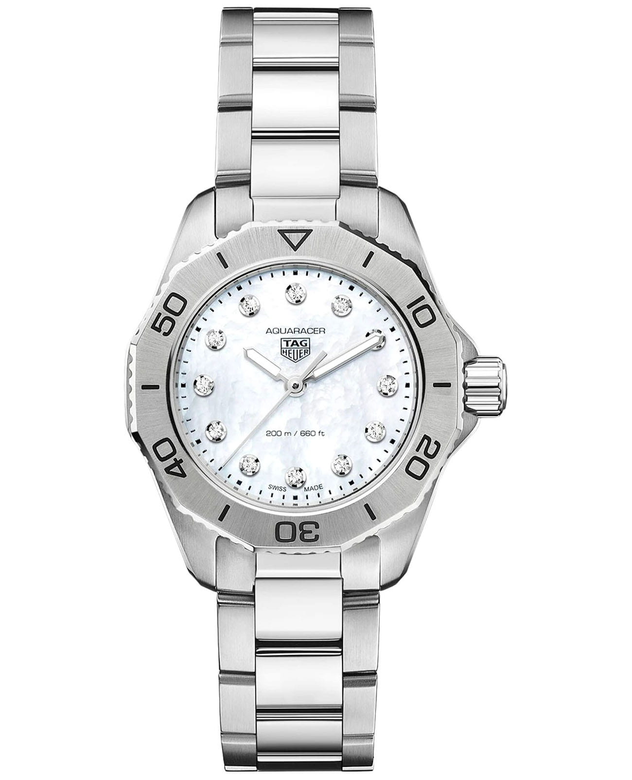 Женские швейцарские часы TAG Heuer Aquaracer Professional 200 WBP1416.BA0622, кварцевый механизм с высокой точностью. Сапфировое стеклоСапфировое стеклоПрочный и надёжный материал из кристалла сапфира синтетического происхождения, характеризующийся особой твёрдостью и устойчивостью к царапинам и повреждениям. устойчивое к появлению царапин, обладающее высокой прозрачностью. Класс водозащиты: 200 метров, позволит плавать, нырять и заниматься другими водными видами спорта. Корпус часов изготовлен из стали. Стальной браслет на раскладной застёжкеРаскладная застёжкаТакой тип застёжки используется только на браслетах из металла. Она никогда не раскрывается полностью, происходит разделение на 2 и более частей. Раскладывающая застёжка снизит вероятность потери часов к минимуму.. Стальной рифленый вращающийся 12-гранный безельБезельВнешний ободок, закрепляющий стекло. В спортивных часах так называется поворотное кольцо с делениями на циферблате, выполняет роль таймера – замеряет отрезки времени на шкале. Неподвижный безель – элемент декора. Однонаправленно вращающийся безель на дайверских часах позволяет фиксировать моменты погружения и выныривания на поверхность. с минутной шкалой выполнен с радиальным сатинированием поверхности. Перламутровый циферблат украшен 12-ю бриллиантами. Метки в виде штрихов. Стрелки и метки с родиевым и люминесцентным покрытиемЛюминесцентное покрытиеПозволяет считывать показания времени в темноте. Производители наносят на стрелки, часовые индексы, безель или поверхность циферблата светонакопительный состав, дающий холодное свечение. Superluminova. Рифленая заводная головка с защитой. Задняя крышка украшена выгравированной 8-лучевой розой ветров на фоне узора сотовой структуры.