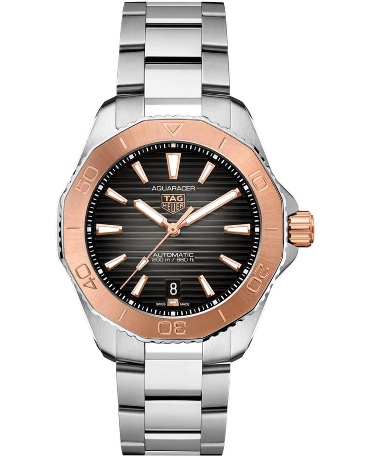 TAG Heuer Aquaracer Professional 200 Date WBP2151.BA0627 — это стильный мужской аксессуар, который сочетает элегантный дизайн и практичность. Высокая функциональность в нем сочетается с изысканной элегантностью, в то время как сапфировое стеклоСапфировое стеклоПрочный и надёжный материал из кристалла сапфира синтетического происхождения, характеризующийся особой твёрдостью и устойчивостью к царапинам и повреждениям. обеспечивает сверхточную разборчивость. Эти часы с Calibre 5 отражают смелый подход к измерению времени. Класс водозащиты: 200 метров, позволит плавать, нырять и заниматься другими водными видами спорта. Часы с люминесцентным покрытиемЛюминесцентное покрытиеПозволяет считывать показания времени в темноте. Производители наносят на стрелки, часовые индексы, безель или поверхность циферблата светонакопительный состав, дающий холодное свечение.. Дымчато-черный циферблат отличается элегантностью, которую подчеркивают контрастные стрелки и метки, покрытые розовым золотом. Корпус часов изготовлен из стали, безельБезельВнешний ободок, закрепляющий стекло. В спортивных часах так называется поворотное кольцо с делениями на циферблате, выполняет роль таймера – замеряет отрезки времени на шкале. Неподвижный безель – элемент декора. Однонаправленно вращающийся безель на дайверских часах позволяет фиксировать моменты погружения и выныривания на поверхность. из стали с 18-каратным золотом18-каратное золотоОбозначение по каратной системе пробирования, оно показывает, сколько драгоценного металла содержится в изделии. 18 карат - в составе 75% чистого золота, соответствует 750 пробе.