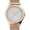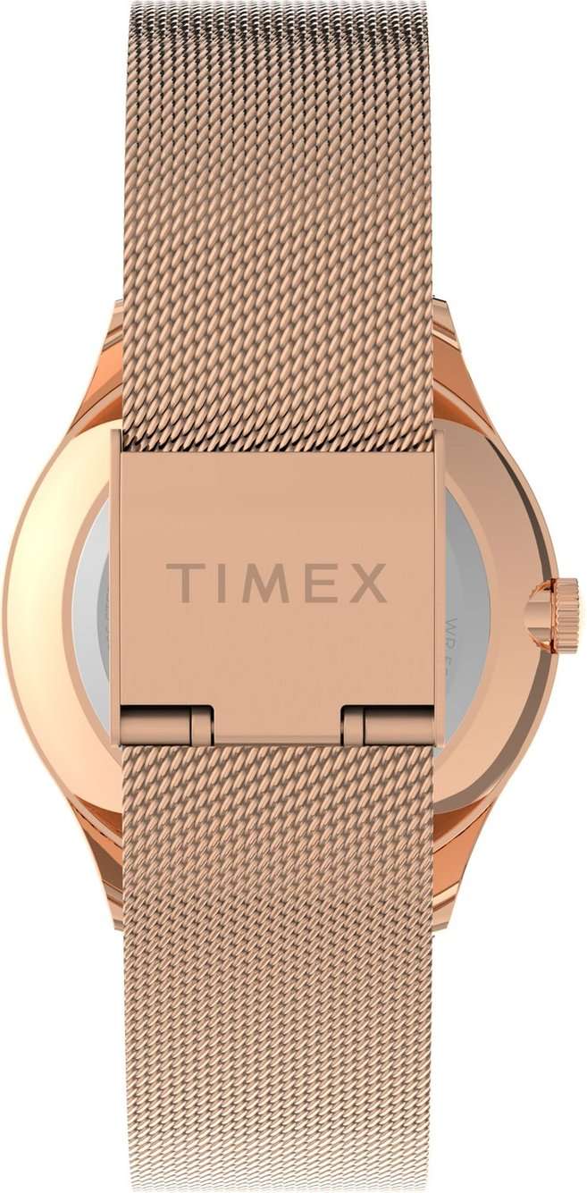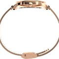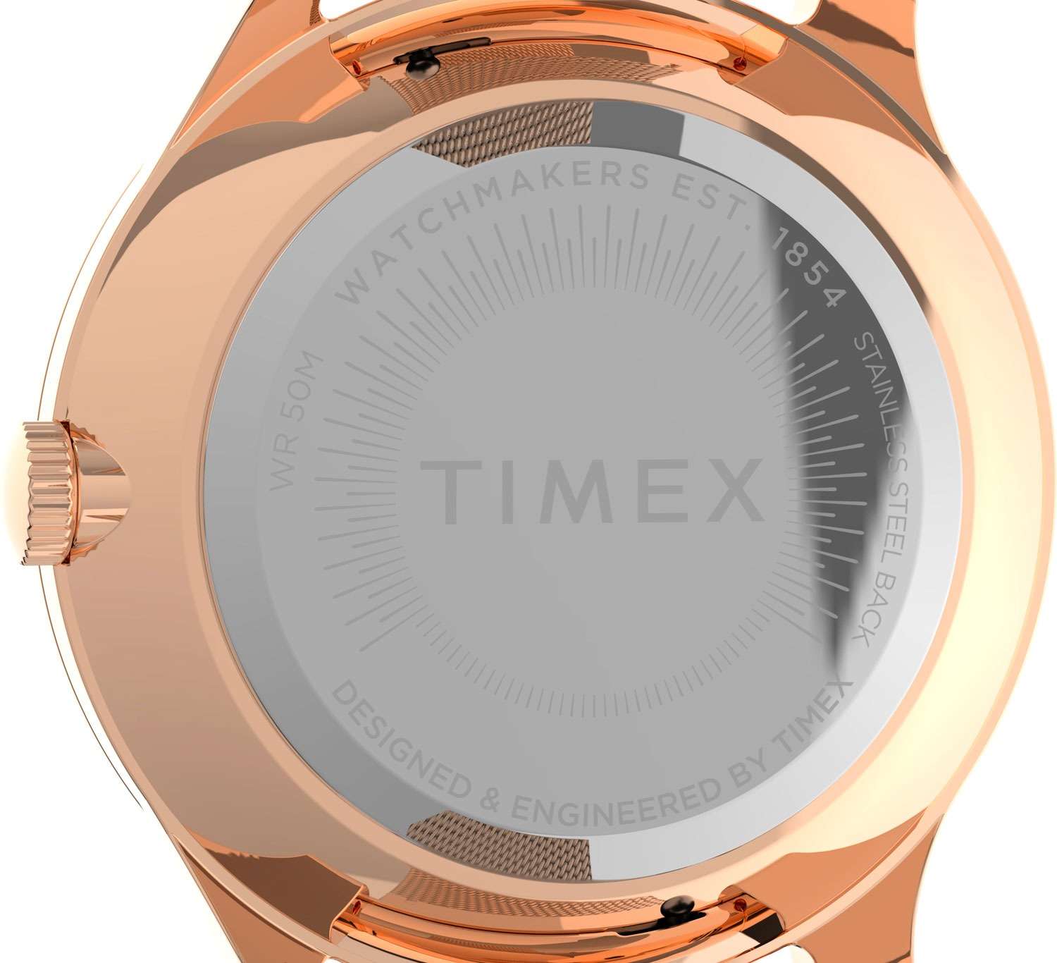 Наручные часы Timex TW2V01400 — это изысканный аксессуар, который станет завершающим штрихом в образе современной амбициозной девушки с утонченным вкусом. Эта модель из США сочетает в себе стиль и функциональность, предлагая кварцевый механизм для надежной точности. Корпус часов выполнен из латуни с розовым PVDPVDУльтратонкое покрытие наносится в технике вакуумного напыления, сочетает в себе нитрид титана особой прочности со слоем золота или оксида хрома. Несёт в себе декоративную или защитную функцию. покрытием, придающим изделию элегантность и современный вид. Серебристый циферблат с эффектом Glitter украшен узкими клиновидными стрелками в стиле Dauphine и метками в виде штрихов, что обеспечивает легкость считывания времени. Рифленая заводная головка добавляет утонченности и завершенности дизайну. Стальной миланский браслет с розовым PVDPVDУльтратонкое покрытие наносится в технике вакуумного напыления, сочетает в себе нитрид титана особой прочности со слоем золота или оксида хрома. Несёт в себе декоративную или защитную функцию. покрытием не только удобен, но и надежен благодаря регулируемом раскладном замкеРаскладной замокДанный вариант застежки используется только на часах с металлическим браслетом. Отличительная особенность такого крепления в том, что длина браслета становится универсальной и вы можете самостоятельно отрегулировать нужный вам размер – застежка просто двигается по браслету часов., который обеспечивает комфортную посадку на запястье. Водозащита 50WR делает часы устойчивыми к влаге, что позволяет использовать их в различных условиях. Минеральное стеклоМинеральное стеклоМинеральное стекло представляет собой искусственно выращенный минерал кварца. Такое стекло отличается особой устойчивостью к повреждениям и царапинам. Уступает по некоторым качествам сапфировому стеклу. защищает циферблат от царапин и повреждений, сохраняя его первоначальный вид. Диаметр корпуса составляет 32 мм, а ширина браслета — 16 мм, что делает часы изящными и подходящими для любого случая.