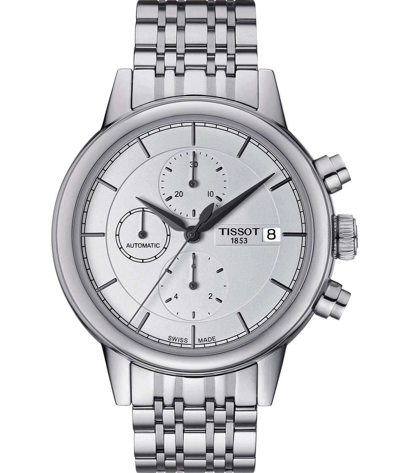 TISSOT T0854271101100 T-Classic Carson  - мужские механические наручные часы Корпус этих часов среднего размера (42,3 мм) и выполнен из нержавеющей стали L316 Модель TISSOT T0854271101100 T-Classic Carson имеет устойчивое к царапинам сапфировое стекло, браслет из нержавеющей стали, белый циферблат Калибр механизма: C01211 Класс водозащиты: 30 м / 3 АТМ (защита от брызг и случайных капель) Дополнительные функции и особенности: отображение числа , секундомер, хронограф, запас хода до 45 часов Полная заводская комплектация TISSOT: оригинальные часы, фирменная коробка, инструкция, сервисная книжка, роман о часовой фабрике, миникаталог, замшевый фирменный чехол черного цвета для хранения и/или переноски часов, кассовый и товарный чеки Международная гарантия 2 года Производство и сборка: Швейцария