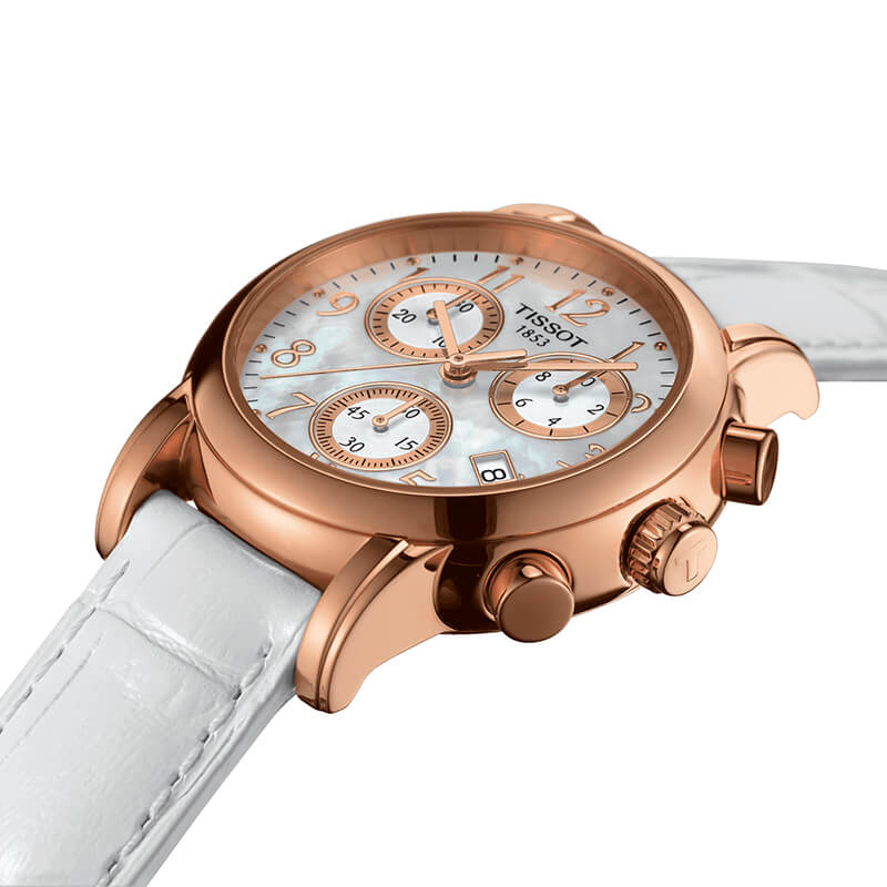 TISSOT Dressport Quartz Chronograph - женские кварцевые наручные часы. Корпус этих часов среднего размера (35 мм) и выполнен из нержавеющей стали L316 с PVD-покрытием цвета розового золота. Модель имеет устойчивое к царапинам сапфировое стекло, ремешок из натуральной кожи белого цвета, перламутровый циферблат. Калибр механизма: ETA G15.211. Класс водозащиты: 30 м / 3 АТМ (защита от брызг и случайных капель). Дополнительные функции и особенности: отображение числа, хронограф (секундомер).