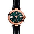 Премиальная модель является настоящим эксклюзивом, в ней прекрасна каждая деталь. Овальный перламутровый циферблат изумрудного цвета инкрустирован 8 бриллиантами цвета Top Wesselton, их сияние идеально сочетается с корпусом из 18-каратного розового золота18-каратное золотоОбозначение по каратной системе пробирования, оно показывает, сколько драгоценного металла содержится в изделии. 18 карат - в составе 75% чистого золота, соответствует 750 пробе.