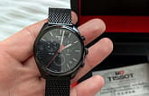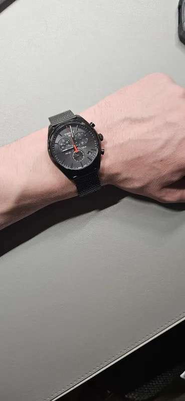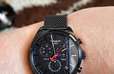 Полностью чёрное исполнение модели не влияет на качество восприятия показателей времени - метки хорошо заметны. Стрелки с люминесцентным покрытиемЛюминесцентное покрытиеПозволяет считывать показания времени в темноте. Производители наносят на стрелки, часовые индексы, безель или поверхность циферблата светонакопительный состав, дающий холодное свечение. облегчают читаемость в тёмное время суток. Модель оснащена высокоточным хронографомХронографФункция позволяет измерять отрезки времени с особой точностью: часы, минуты, секунды. Верным признаком хронографа является наличие на циферблате 3 дополнительных окошек-счётчиков., секундомером, апертурой даты. Кварцевый механизм ETA G10.211. Стекло из сапфира. Водонепроницаемость 100 метров. Браслет миланского плетения. Износоустойчивое PVD-покрытиеPVDУльтратонкое покрытие наносится в технике вакуумного напыления, сочетает в себе нитрид титана особой прочности со слоем золота или оксида хрома. Несёт в себе декоративную или защитную функцию.. Габариты: 41 x 41 x 10,7 мм.
