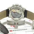 Дизайнеры выбрали для модели суженный безельБезельВнешний ободок, закрепляющий стекло. В спортивных часах так называется поворотное кольцо с делениями на циферблате, выполняет роль таймера – замеряет отрезки времени на шкале. Неподвижный безель – элемент декора. Однонаправленно вращающийся безель на дайверских часах позволяет фиксировать моменты погружения и выныривания на поверхность., такая особенность зрительно увеличивает циферблат и ускоряет процесс считывания показателей. Массивный стальной корпус сочетается с ремешком из натуральной коровьей кожи, поверхность имитирует рисунок кожи крокодила. Метки и стрелки имеют люминесцентное покрытиеЛюминесцентное покрытиеПозволяет считывать показания времени в темноте. Производители наносят на стрелки, часовые индексы, безель или поверхность циферблата светонакопительный состав, дающий холодное свечение., что позволяет использовать часы в темноте. Швейцарский калибр ETA C01.211 с запасом хода 45 часов. Сапфировое стекло устойчиво к возникновению царапин. Водонепроницаемость до 20 бар. . Секундомер, апертура даты. Габариты: 43 x 44 x 16,3 мм.