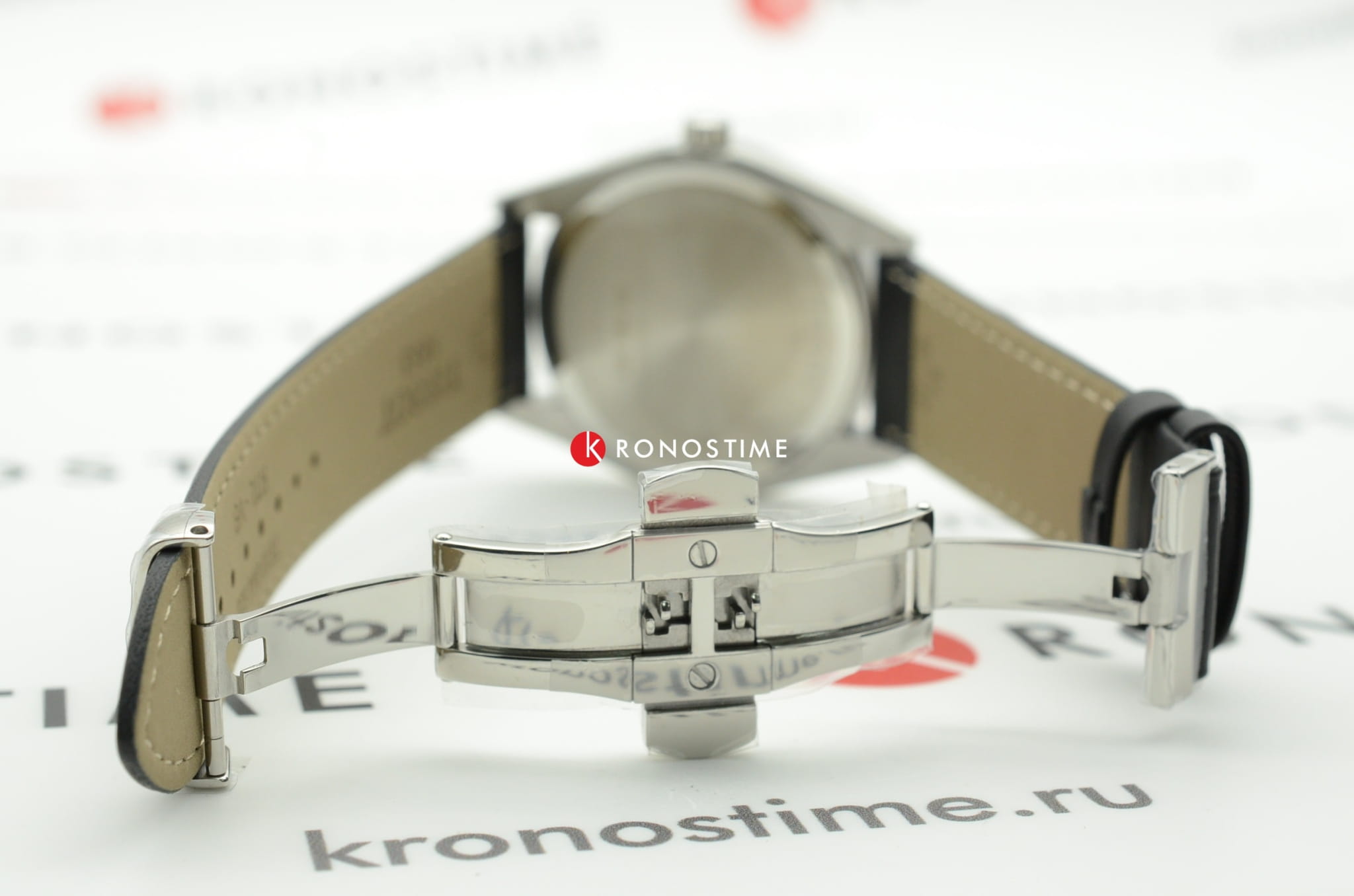 Тёмный ремешок из натуральной кожи и циферблат сочетаются с серебристым оттенком корпуса из хирургической стали. Люминесцентная подсветкаЛюминесцентное покрытиеПозволяет считывать показания времени в темноте. Производители наносят на стрелки, часовые индексы, безель или поверхность циферблата светонакопительный состав, дающий холодное свечение. делает возможным использование часов теперь и в тёмное время суток. Кварцевый высокоточный механизм ETA F06.115. Стекло из сапфира, устойчивое к возникновению царапин и отметин. Апертура даты, индикатор EOLEOLПредставляет собой систему, уведомляющую владельца часов о необходимости замены элемента питания. За 2 недели до полного разряда батарейки секундная стрелка перестаёт ходить чётко и начинает перепрыгивать на 3-4 деления.. Габариты: 40 x 40 x 8,52 мм.