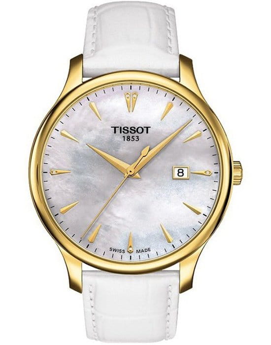 TISSOT T0636103611600 T-Classic Tradition Quartz - женские кварцевые наручные часы Корпус этих часов среднего размера (42 мм) и выполнен из нержавеющей стали L316 с PVD-покрытием цвета желтого золота Модель TISSOT T0636103611600 T-Classic Tradition Quartz имеет устойчивое к царапинам сапфировое стекло, ремешок из натуральной кожи белого цвета, перламутровый циферблат Циферблат украшен 5 бриллиантами в районе 12, 3, 6 и 9 часов Калибр механизма: ETA F06111 Класс водозащиты: 30 м / 3 АТМ (защита от брызг и случайных капель) Дополнительные функции и особенности: отображение числа Полная заводская комплектация TISSOT: оригинальные часы, фирменная коробка, инструкция, сервисная книжка, роман о часовой фабрике, миникаталог, замшевый фирменный чехол черного цвета для хранения и/или переноски часов, кассовый и товарный чеки Международная гарантия 2 года Производство и сборка: Швейцария