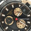 Внешний облик модели был вдохновлён лучшими гоночными мотоциклами. Массивный корпус имеет крупные детали, на чёрном циферблате чётко выделяются золотистые счётчики хронографаХронографФункция позволяет измерять отрезки времени с особой точностью: часы, минуты, секунды. Верным признаком хронографа является наличие на циферблате 3 дополнительных окошек-счётчиков., стрелки и метки с люминесцентным покрытиемЛюминесцентное покрытиеПозволяет считывать показания времени в темноте. Производители наносят на стрелки, часовые индексы, безель или поверхность циферблата светонакопительный состав, дающий холодное свечение.. Динамичный аксессуар позволит заявить о себе в любой ситуации, эксклюзивности добавляет прозрачная задняя крышка в виде колеса. Кварцевый механизм ETA G10.212. Корпус с золотистым PVD-покрытиемPVDУльтратонкое покрытие наносится в технике вакуумного напыления, сочетает в себе нитрид титана особой прочности со слоем золота или оксида хрома. Несёт в себе декоративную или защитную функцию.. Гибкий силиконовый ремешок. Секундомер, отображение текущего числа. Габариты: 47,6 x 43 x 12,3 мм.
