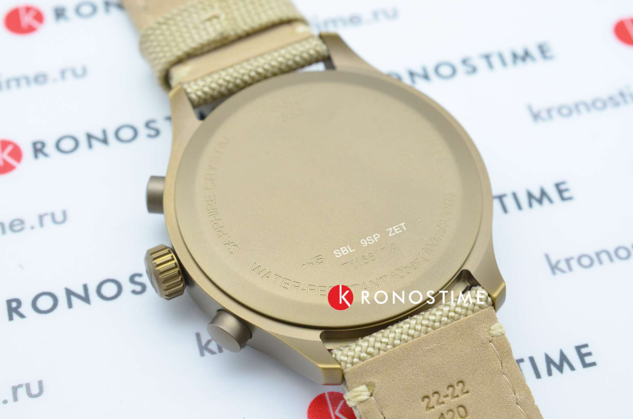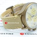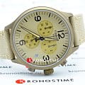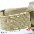 Модель выполнена в лаконичном бежевом цвете, исключение составляет PVD-покрытиеPVDУльтратонкое покрытие наносится в технике вакуумного напыления, сочетает в себе нитрид титана особой прочности со слоем золота или оксида хрома. Несёт в себе декоративную или защитную функцию. корпуса оттенка хаки. Циферблат дополнен арабскими цифрами и миниатюрными счётчиками хронографа. Тканевый ремешок красиво смотрится на запястье, материал обеспечивает комфортное ношение. Высокоточный кварцевый механизм ETA G10.212. Водонепроницаемость при давлении 10 бар. Люминесцентная подсветкаЛюминесцентное покрытиеПозволяет считывать показания времени в темноте. Производители наносят на стрелки, часовые индексы, безель или поверхность циферблата светонакопительный состав, дающий холодное свечение. стрелок. ХронографХронографФункция позволяет измерять отрезки времени с особой точностью: часы, минуты, секунды. Верным признаком хронографа является наличие на циферблате 3 дополнительных окошек-счётчиков., секундомер, отображение текущего числа. Габариты: 45 x 45 x 11 мм.