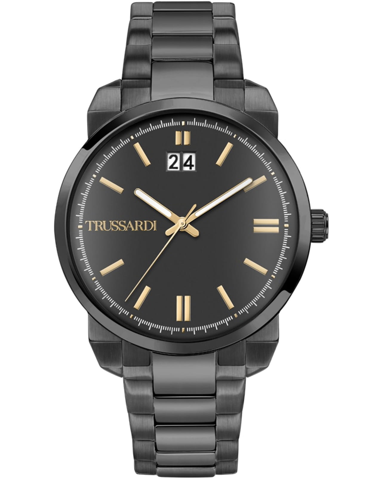 Итальянские мужские часы Trussardi T-City R2453154004 - это стильный мужской аксессуар, который сочетает элегантный дизайн и практичность. Корпус выполнен из нержавеющей стали с IP-покрытиемIP-покрытиеМетод ионного напыления. Демонстрирует повышенную устойчивость к истиранию, окислению и химическим веществам. Под воздействием высокого давления и температуры около 1500°C молекулы металла надёжно соединяются с частицами корпуса часов., что обеспечивает долговечность и утончённый внешний вид. Надежное минеральное стеклоМинеральное стеклоМинеральное стекло представляет собой искусственно выращенный минерал кварца. Такое стекло отличается особой устойчивостью к повреждениям и царапинам. Уступает по некоторым качествам сапфировому стеклу. защищает циферблат от царапин и обеспечивает долговечность. Модель оснащена кварцевым механизмом, обеспечивающим высокую точность хода. Браслет из нержавеющей стали с IP-покрытиемIP-покрытиеМетод ионного напыления. Демонстрирует повышенную устойчивость к истиранию, окислению и химическим веществам. Под воздействием высокого давления и температуры около 1500°C молекулы металла надёжно соединяются с частицами корпуса часов.  с раскладной застёжкойРаскладная застёжкаТакой тип застёжки используется только на браслетах из металла. Она никогда не раскрывается полностью, происходит разделение на 2 и более частей. Раскладывающая застёжка снизит вероятность потери часов к минимуму. обеспечивает комфортное ношение. Водозащита 50 метров позволит защитить корпус от случайных брызг или капель дождя. Стрелки оснащены люминесцентным покрытиемЛюминесцентное покрытиеПозволяет считывать показания времени в темноте. Производители наносят на стрелки, часовые индексы, безель или поверхность циферблата светонакопительный состав, дающий холодное свечение., обеспечивающим отличную видимость даже при слабом освещении. Окошко даты в положении 12 часов. Эта модель – отличный выбор для тех, кто ищет сочетание стиля, качества и функциональности. Часы станут не только полезным аксессуаром, но и выразительным элементом вашего имиджа.