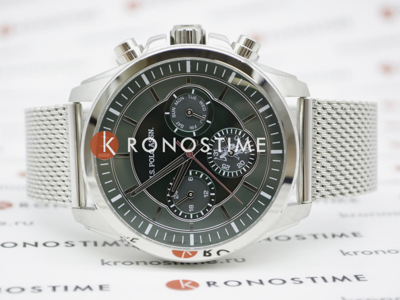 Мужские часы U.S. Polo Assn. Crossing USPA1028-08, кварцевый механизм с высокой точностью. Минеральное стеклоМинеральное стеклоМинеральное стекло представляет собой искусственно выращенный минерал кварца. Такое стекло отличается особой устойчивостью к повреждениям и царапинам. Уступает по некоторым качествам сапфировому стеклу. устойчивое к появлению царапин, обладающее высокой прозрачностью. Корпус изготовлен из нержавеющей стали. На циферблате три дополнительных индикатора. Центральные часовая, минутная и секундная стрелки. Индикация даты и дня недели. 12/24х часовой формат времени. Стрелки с люминесцентным покрытиемЛюминесцентное покрытиеПозволяет считывать показания времени в темноте. Производители наносят на стрелки, часовые индексы, безель или поверхность циферблата светонакопительный состав, дающий холодное свечение.. Класс водозащиты: 50 метров, позволит защитить корпус от случайных брызг или капель дождя. Стальной браслет миланского плетения на раскладном замкеРаскладной замокДанный вариант застежки используется только на часах с металлическим браслетом. Отличительная особенность такого крепления в том, что длина браслета становится универсальной и вы можете самостоятельно отрегулировать нужный вам размер – застежка просто двигается по браслету часов..