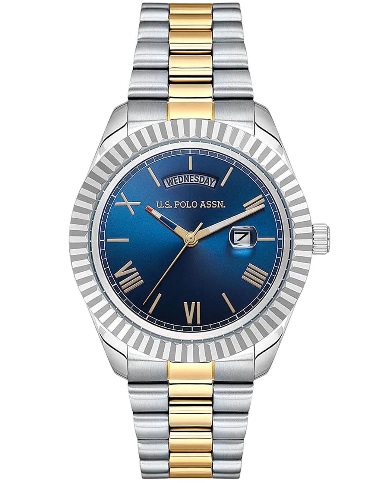 Мужские американские часы U.S. Polo Assn. Fundamental USPA1100B-06 обладают кварцевым механизмом с высокой точностью. Минеральное стеклоМинеральное стеклоМинеральное стекло представляет собой искусственно выращенный минерал кварца. Такое стекло отличается особой устойчивостью к повреждениям и царапинам. Уступает по некоторым качествам сапфировому стеклу. устойчивое к появлению царапин, обладающее высокой прозрачностью. Изысканный корпус изготовлен из нержавеющей стали, диаметром 42 мм. Лаконичные центральные часовая, минутная и секундная стрелки. Стрелки с люминесцентным покрытиемЛюминесцентное покрытиеПозволяет считывать показания времени в темноте. Производители наносят на стрелки, часовые индексы, безель или поверхность циферблата светонакопительный состав, дающий холодное свечение., обеспечивающим хорошую читаемость в темноте. Класс водозащиты: 50 метров позволит защитить корпус от случайных брызг или капель дождя. Окошко даты находится в положении 3 часа, окошко дня недели в положении 12 часов. Стальной браслет с частичным PVD-покрытиемPVDУльтратонкое покрытие наносится в технике вакуумного напыления, сочетает в себе нитрид титана особой прочности со слоем золота или оксида хрома. Несёт в себе декоративную или защитную функцию. на раскладной застёжкеРаскладная застёжкаТакой тип застёжки используется только на браслетах из металла. Она никогда не раскрывается полностью, происходит разделение на 2 и более частей. Раскладывающая застёжка снизит вероятность потери часов к минимуму. обеспечивает комфорт и удобство в использовании, добавляя завершающий штрих к этому стильному и высокоэффективному аксессуару. Это практичный и стильный инструмент для активной повседневности, объединяющий точный механизм и удобство.