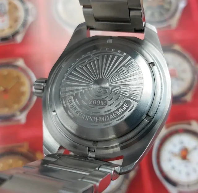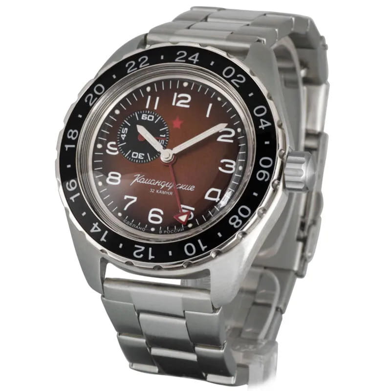 Мужские российские механические наручные часы Восток Командирские 02017А, механический механизм (автоматический калибр) с высокой точностью. Класс водозащиты: 200 метров, позволит плавать, нырять и заниматься другими водными видами спорта. Стрелки с люминесцентным покрытиемЛюминесцентное покрытиеПозволяет считывать показания времени в темноте. Производители наносят на стрелки, часовые индексы, безель или поверхность циферблата светонакопительный состав, дающий холодное свечение.. Вращающийся безельБезельВнешний ободок, закрепляющий стекло. В спортивных часах так называется поворотное кольцо с делениями на циферблате, выполняет роль таймера – замеряет отрезки времени на шкале. Неподвижный безель – элемент декора. Однонаправленно вращающийся безель на дайверских часах позволяет фиксировать моменты погружения и выныривания на поверхность. из нержавеющей стали с PVDPVDУльтратонкое покрытие наносится в технике вакуумного напыления, сочетает в себе нитрид титана особой прочности со слоем золота или оксида хрома. Несёт в себе декоративную или защитную функцию. покрытием. Дополнительная 24-часовая стрелка. Механизм калибра 24 мм с боковой секундной стрелкой. Автоподзавод с предохранительным устройством от перезаводки пружины. Частота: 19800 полуколебаний/час. Браслет с раскладной застёжкойРаскладная застёжкаТакой тип застёжки используется только на браслетах из металла. Она никогда не раскрывается полностью, происходит разделение на 2 и более частей. Раскладывающая застёжка снизит вероятность потери часов к минимуму..