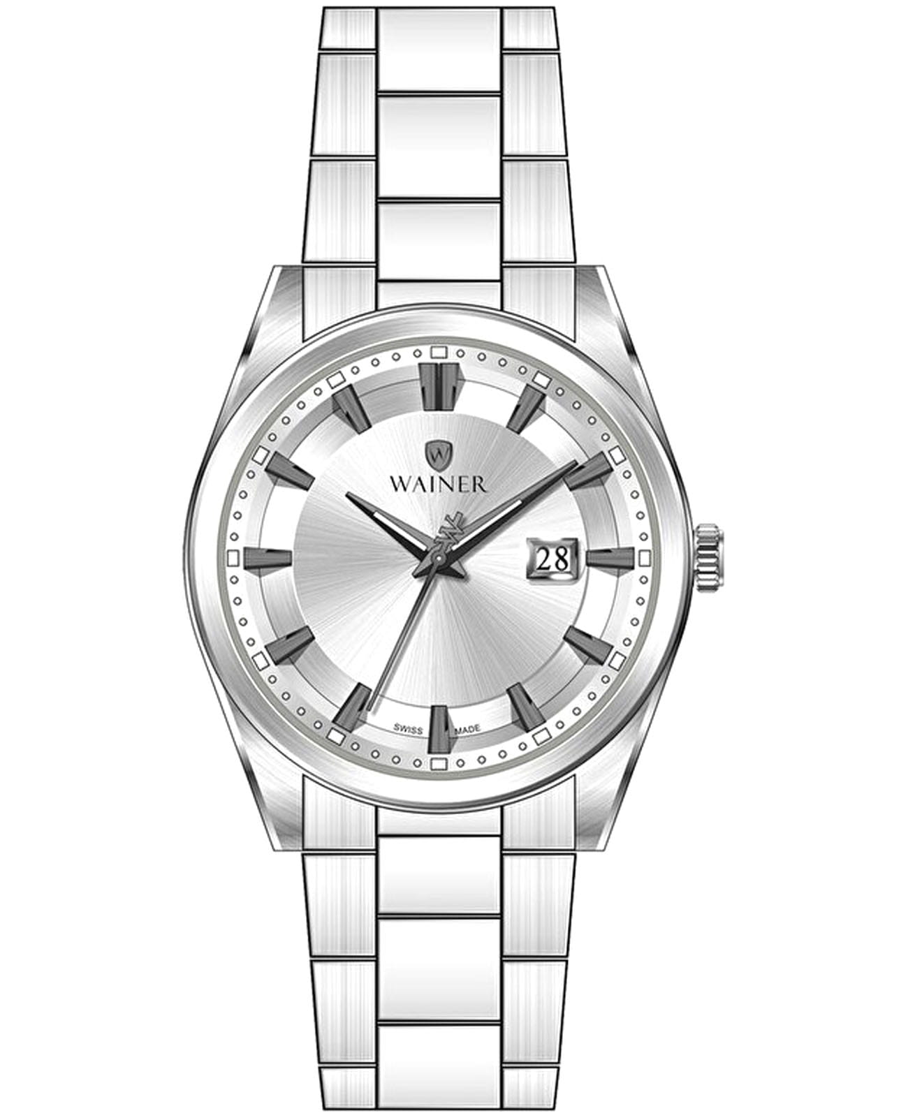 Мужские кварцевые часы WA.17200-A сочетают в себе элегантный дизайн и высокое качество исполнения. Корпус выполнен из нержавеющей стали серебристого цвета диаметром 41 мм, обеспечивает прочность и долговечность. Циферблат с метками в виде штрихов выполнен по технологии Sunray (солнечные лучи) и украшен фирменным логотипом Wainer. Сапфировое стеклоСапфировое стеклоПрочный и надёжный материал из кристалла сапфира синтетического происхождения, характеризующийся особой твёрдостью и устойчивостью к царапинам и повреждениям. защищает дисплей от царапин и механических повреждений. Окошко даты находится в положении 3 часа. Стрелки с люминесцентным покрытиемЛюминесцентное покрытиеПозволяет считывать показания времени в темноте. Производители наносят на стрелки, часовые индексы, безель или поверхность циферблата светонакопительный состав, дающий холодное свечение., улучшая читаемость в условиях недостаточного освещения. Стальной браслет на застёжке-бабочкеЗастёжка "бабочка"Такой вид застёжки дополняется предохранителями, помогающими избежать случайного раскрытия браслета. Обладают изящным исполнением. обеспечивает комфортное ношение на запястье. Водонепроницаемость до 50 метров позволит защитить корпус от случайных брызг или капель дождя. Wainer — это стильный и надежный аксессуар для тех, кто ценит швейцарское качество и современные технологии.
