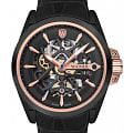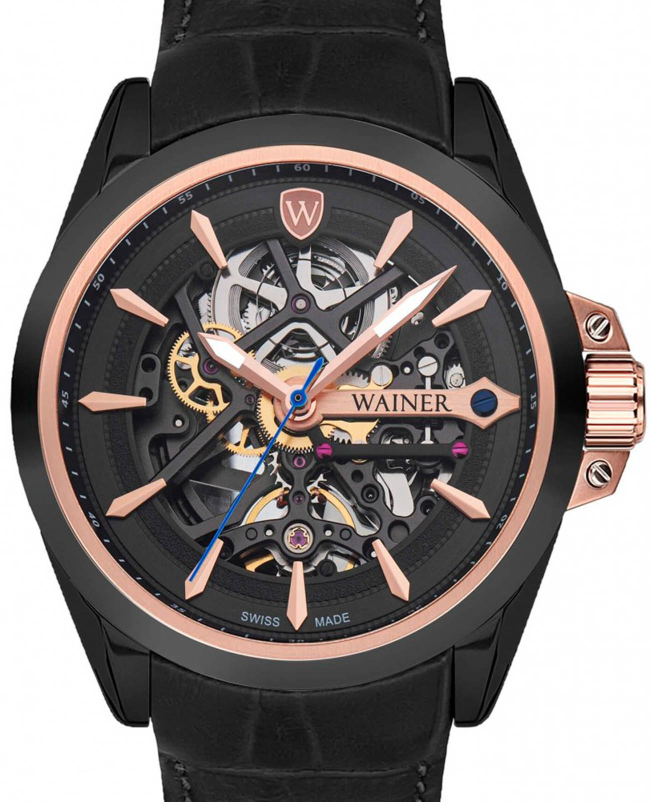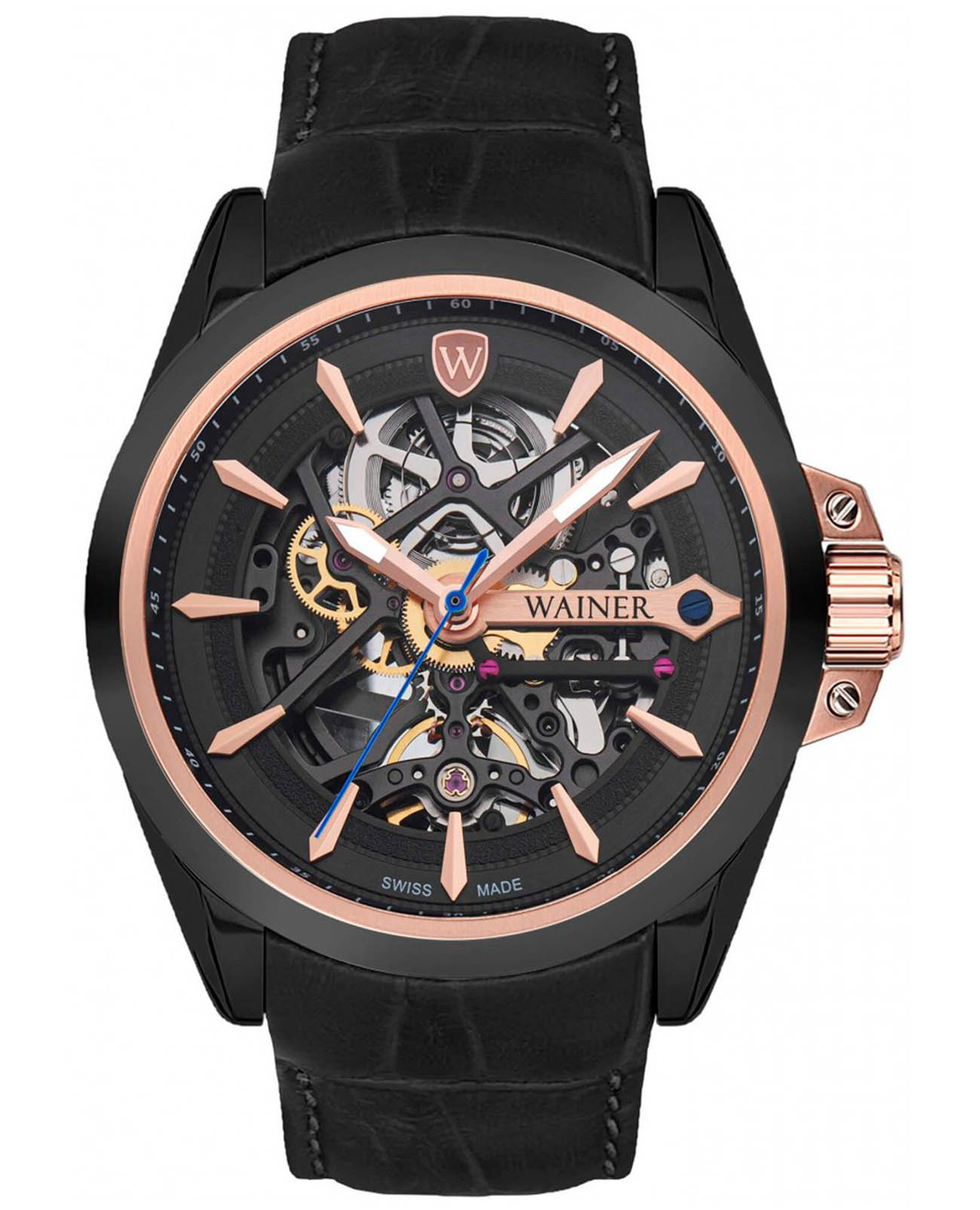 Мужские механические часы Wainer 25677-E — это стильный аксессуар, сочетающий в себе швейцарское качество и функциональность. Модель выполнена из нержавеющей стали 316L с PVD-покрытиемPVDУльтратонкое покрытие наносится в технике вакуумного напыления, сочетает в себе нитрид титана особой прочности со слоем золота или оксида хрома. Несёт в себе декоративную или защитную функцию., что придаёт ей устойчивость к царапинам и благородный внешний вид. Циферблат чёрного цвета дополнен , а его поверхность защищена сапфировым стекломСапфировое стеклоПрочный и надёжный материал из кристалла сапфира синтетического происхождения, характеризующийся особой твёрдостью и устойчивостью к царапинам и повреждениям., устойчивым к повреждениям. Прозрачная задняя крышка позволяет наблюдать за работой механизма, подчёркивая внимание к деталям. Стрелки и метки имеют люминесцентное покрытиеЛюминесцентное покрытиеПозволяет считывать показания времени в темноте. Производители наносят на стрелки, часовые индексы, безель или поверхность циферблата светонакопительный состав, дающий холодное свечение., обеспечивающее отличную читаемость даже в условиях слабого освещения. Часы оснащены автоматическим механизмом Landeron Depa DP20, обеспечивающим запас хода и минимальное обслуживание. Водонепроницаемость позволяет использовать модель при плавании и других водных активностях без глубокого погружения. Браслет из кожи шириной 24-22 мм оснащён стандартной застёжкой, обеспечивающей комфорт и надёжную фиксацию на запястье. Эти часы станут универсальным аксессуаром для тех, кто ценит сочетание стиля, функциональности и швейцарского мастерства — идеальный выбор для повседневной носки и активного образа жизни.
