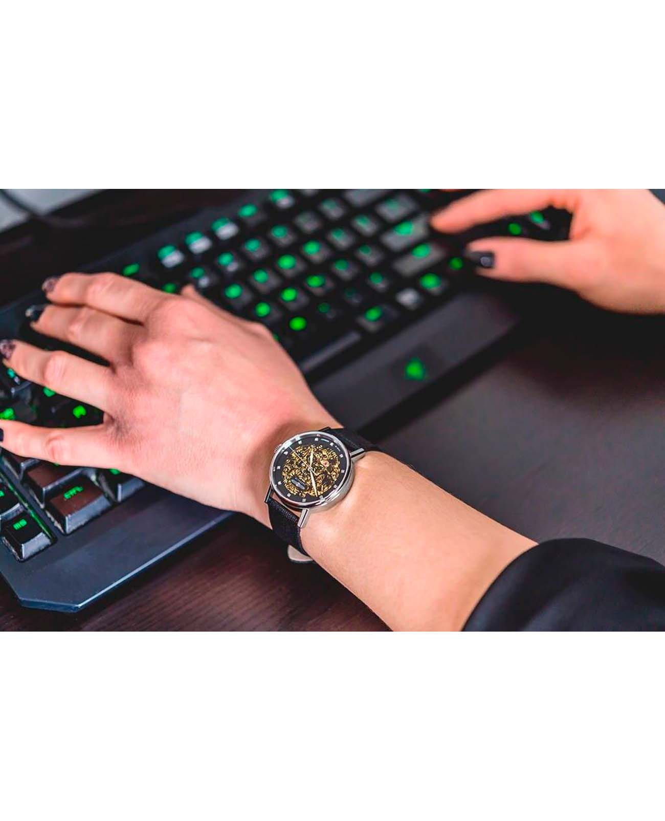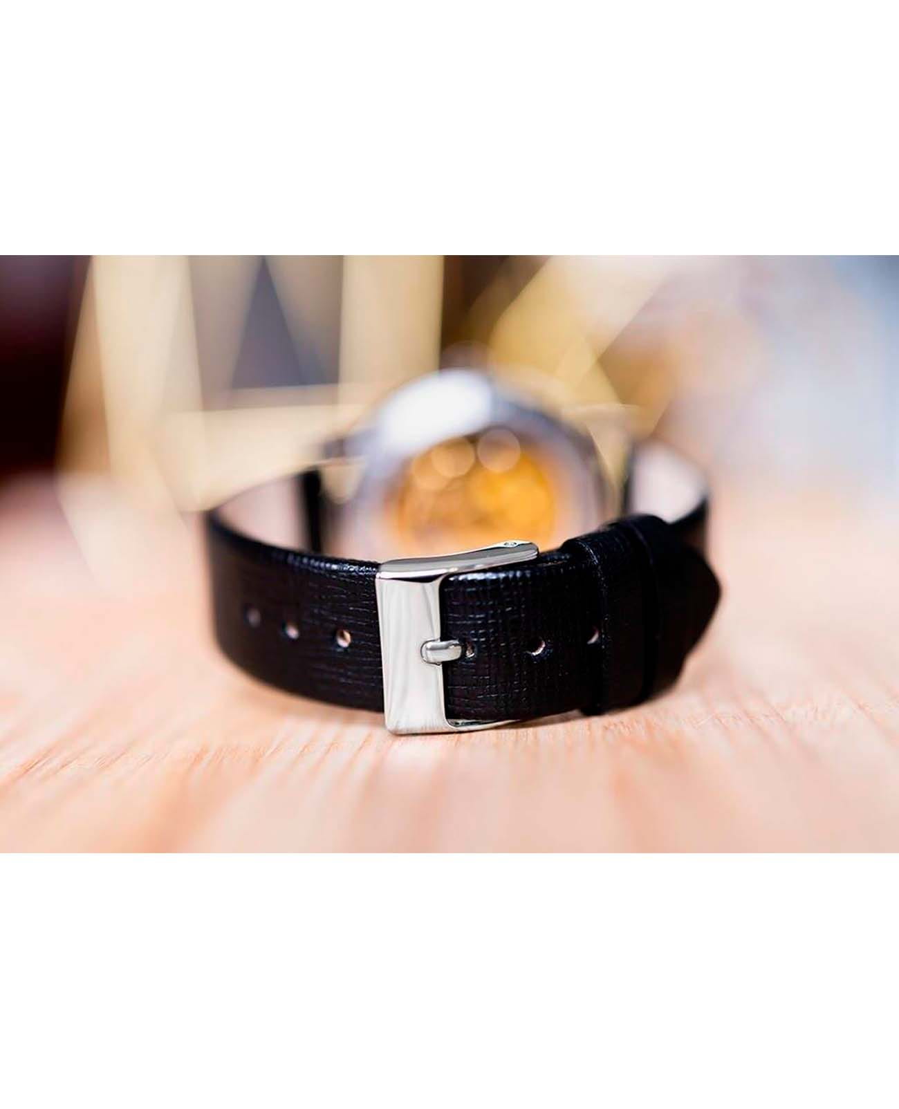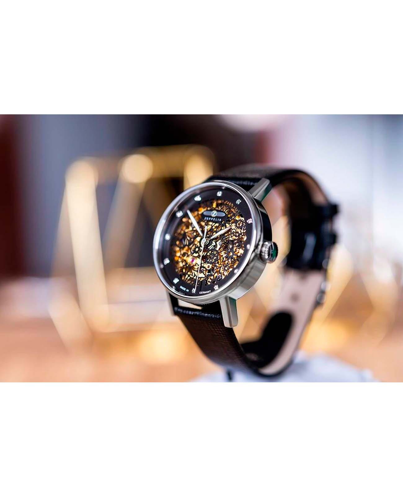 Женские наручные часы Zeppelin Princess of the Sky 7461-2 сочетают в себе элегантный дизайн и точность автоматического механизма. Модель обладает круглым корпусом диаметром 36 мм, изготовленным из нержавеющей стали, что обеспечивает высокую устойчивость к внешним воздействиям. Браслет выполнен из чёрной кожи с классической застежкой, гарантирующей комфортное ношение и стильный внешний вид. Циферблат скелетонирован, открывая взору механизм с 21 драгоценным камнем, и украшен тонкими узорчатыми деталями, добавляющими особый шарм и элегантность. Для защиты используется минеральное стеклоМинеральное стеклоМинеральное стекло представляет собой искусственно выращенный минерал кварца. Такое стекло отличается особой устойчивостью к повреждениям и царапинам. Уступает по некоторым качествам сапфировому стеклу. с антибликовое покрытиеАнтибликовое покрытиеСлой оксида металла в 0,13-0,3 микрон, благодаря которому стекло часов не бликует и не отражает свет. Антибликовое покрытие уменьшает отражение света в 10 раз, обеспечивая отличную читаемость показателей циферблата., обеспечивающее прочную защиту от царапин и отличную видимость циферблата. Часы работают на автоматическом механизме Citizen-Miyota 8N24G с запасом хода около 40 часов и частотой работы 21600 а/h, который не требует замены батареек и заряжается за счет движения руки. Водонепроницаемость часов достигает 5 атмосфер (50 метров), что позволяет использовать их в повседневной жизни, но не рекомендуется для плавания или дайвинга.